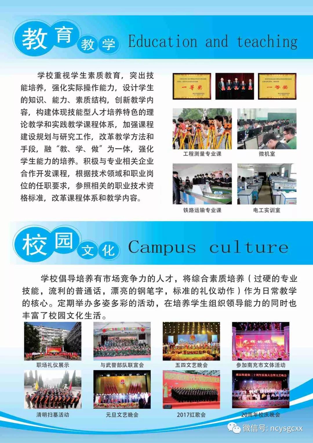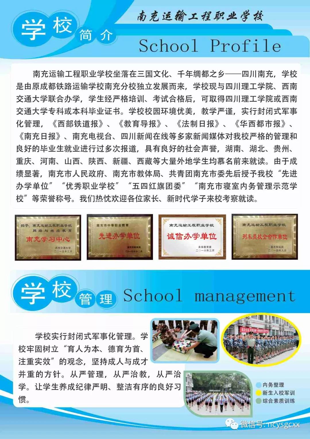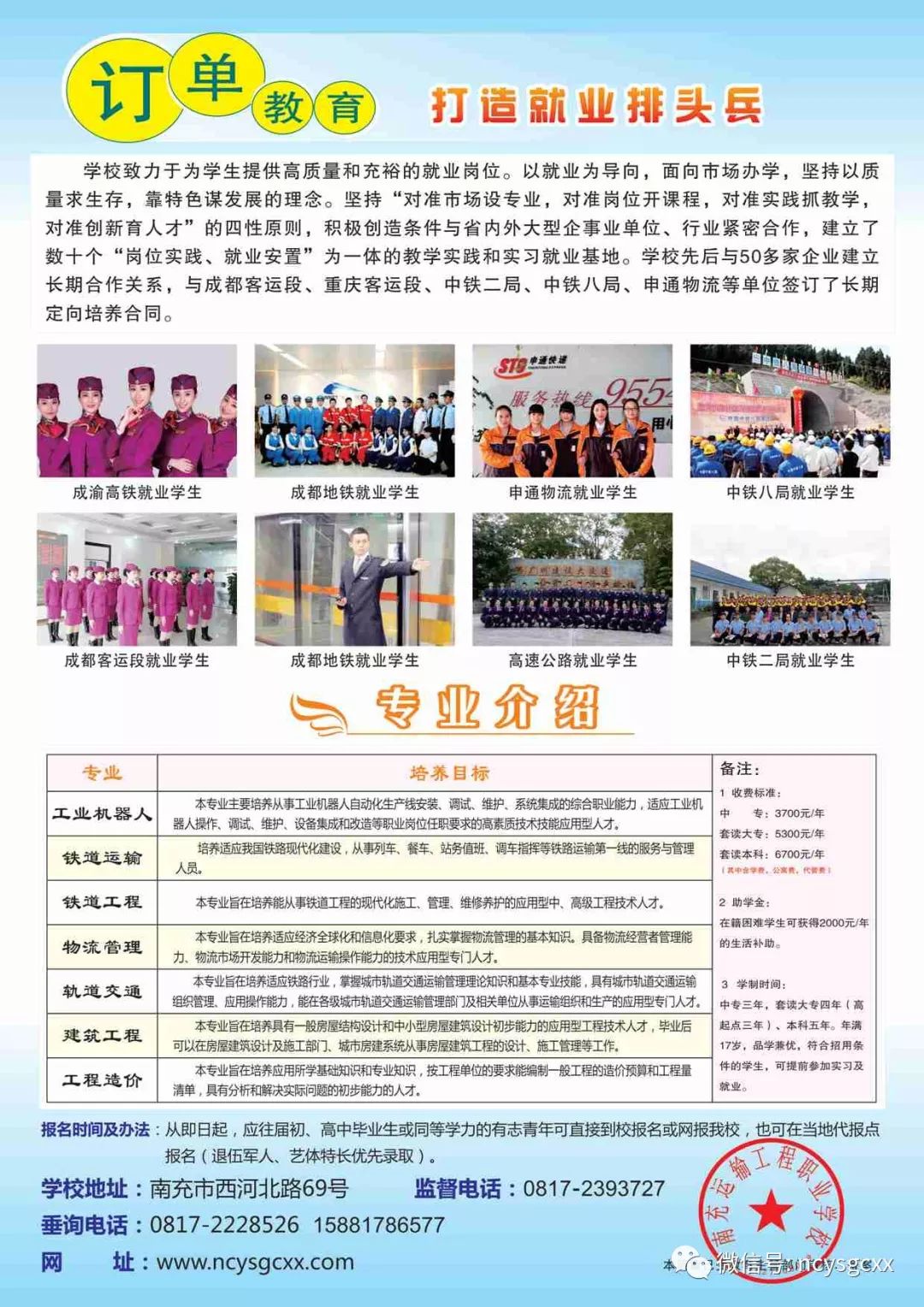 南充市职业教育先进单位——南充运输工程学校(成都铁路运输学校南充分校),自建校以来,一直秉承“诚信为本、打造特色、服务社会”的办学理念,致力于铁路运输、铁道工程等专业人才的培养。学校与国内数十家知名铁路企业建立了长期用工合作关系,实行“订单式”教育模式,对口开设了铁路系统需要的热门适用专业,培养铁路行业急需的专业技术人才,学生入学便可签订就业安置合同。学校以培养人才为中心,通过理论与实践相结合,对学生进行系统培训,让学生掌握扎实的岗位技能,从而保证了学生的高素质、保持了高就业率,用人单位满意率高。该校每年有上千名毕业生奔赴全国各地铁路系统工作,真正实现了“学生、用人单位、家长”三满意,取得了良好的社会信誉,在校生人数不断攀升,成为我市职业教育的品牌学校。