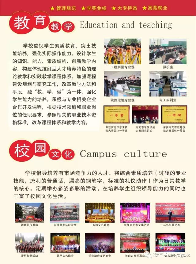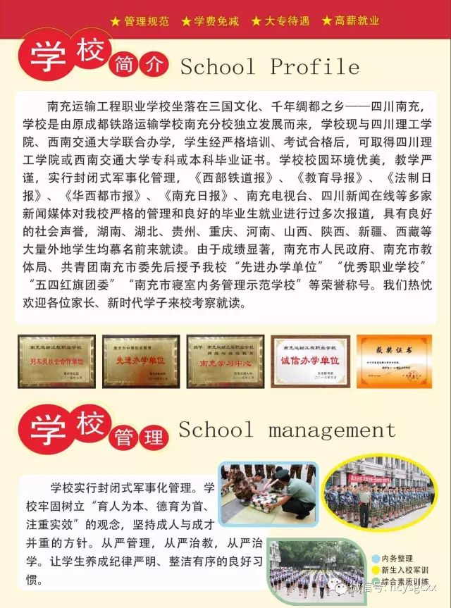 南充市职业教育先进单位——南充运输工程学校(成都铁路运输学校南充分校),自建校以来,一直秉承“诚信为本、打造特色、服务社会”的办学理念,致力于铁路运输、铁道工程等专业人才的培养。学校与国内数十家知名铁路企业建立了长期用工合作关系,实行“订单式”教育模式,对口开设了铁路系统需要的热门适用专业,培养铁路行业急需的专业技术人才,学生入学便可签订就业安置合同。学校以培养人才为中心,通过理论与实践相结合,对学生进行系统培训,让学生掌握扎实的岗位技能,从而保证了学生的高素质、保持了高就业率,用人单位满意率高。该校每年有上千名毕业生奔赴全国各地铁路系统工作,真正实现了“学生、用人单位、家长”三满意,取得了良好的社会信誉,在校生人数不断攀升,成为我市职业教育的品牌学校。