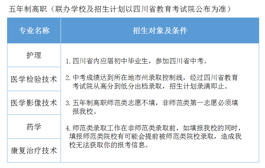 与四川国际标榜职业技术学院联合举办“涉外护理日本定向班”;同时与四川天府通用航空职业学院、四川科技职业学院、四川国际标榜职业技术学院、眉山药科职业学院、四川天一学院、四川城市职业学院、南充科技职业学院等建立紧密合作关系,联合举办 “3+3”分段普通专科。通过以上措施可实现大专升学率90%以上,可圆绝大多数学生的大学梦。