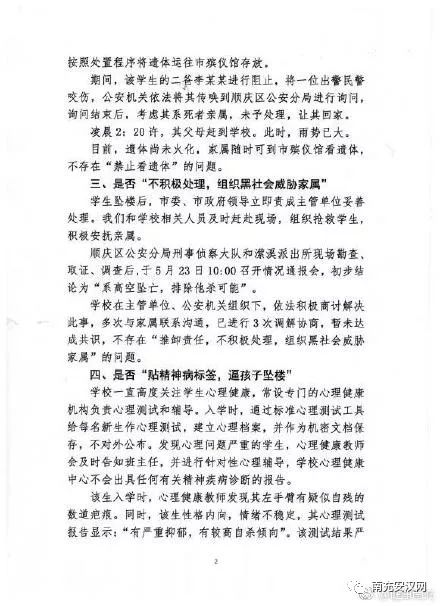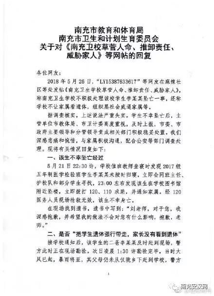 @健康南充发贴:据相关部门调查核实,上述说法严重失实。学生不幸坠亡后,主管单位市教体局、市卫计委高度重视,及时上报,市委、市政府主要领导和分管领导责成相关部门积极稳妥处置。我们深感悲痛和惋惜,与家属积极沟通,配合公安等部门调查处理。现将有关情况回复如下!