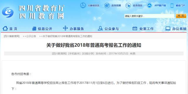 四川省2018年普通高等学校招生网上报名工作将于2017年11月1日至6日进行。为了做好报名阶段工作,四川省教育厅现将有关事项通知如下:
