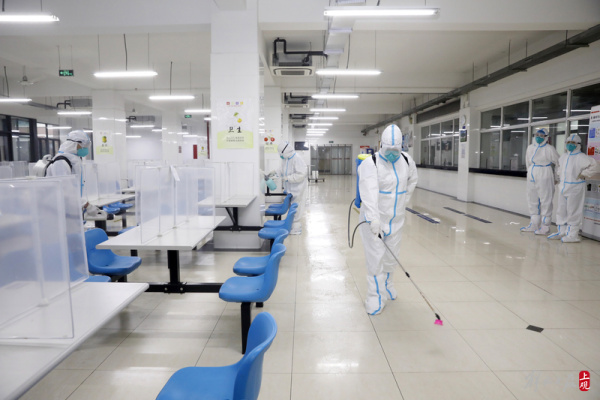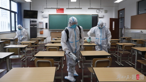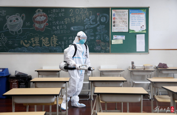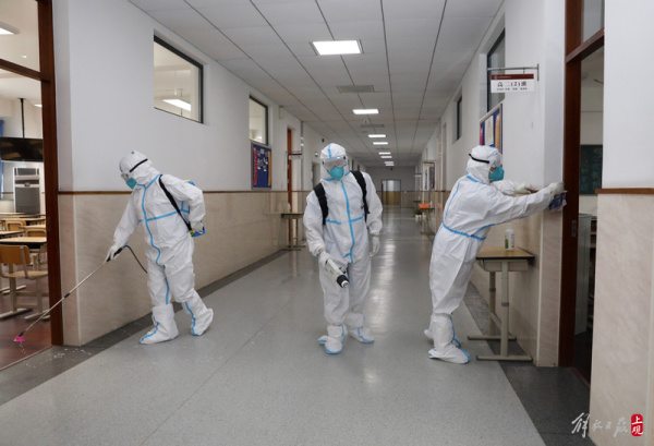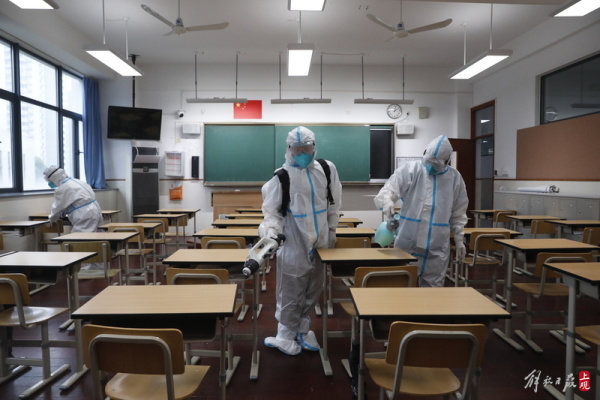 2022年6月1日,位于黄浦区的五爱高级中学开展了一场学生返校前的校园环境大消杀工作。消毒由学校后勤部门和卫生老师组成消毒专班负责执行,对教学楼走廊、教室、卫生间、食堂、学生宿舍等进行无死角的预防性消杀。