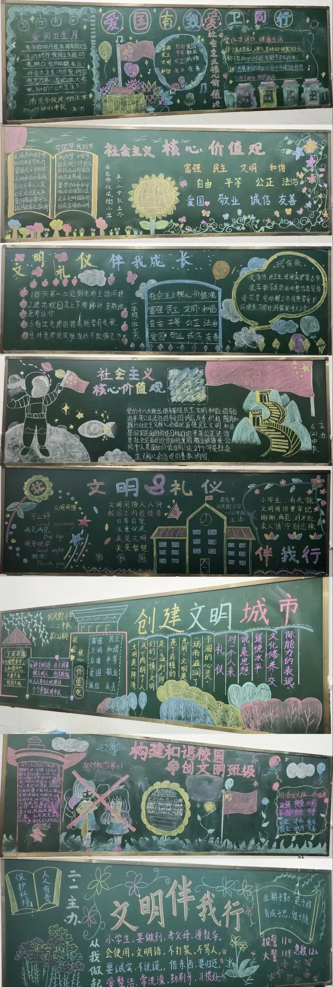 学校还开展了爱国卫生运动、文明礼仪、社会主义核心价值观为主题的黑板报评比活动。得到了全校师生的积极响应,在班主任的指导下,各班学生利用课余时间,紧紧围绕主题,自己动手绘画、制作出一幅幅设计新颖、个性鲜明、内容丰富的板报,赞美劳动最光荣,讴歌劳动创造幸福生活,向劳动者致敬……学校德育处从版面设计、内容主题、文字插图、色彩搭配等方面进行评比。同时,各班主任还巧妙抓住此次黑板报设计评比活动的机会,对全班同学进行“劳动最光荣,劳动最美丽”教育,从而激发了学生向劳动者致敬的情感,尊重所有劳动者,并体现在日常生活中。学生们感受到能有今天的美好生活,都来源于前辈的艰苦奋斗,更加珍惜现在拥有的幸福生活。