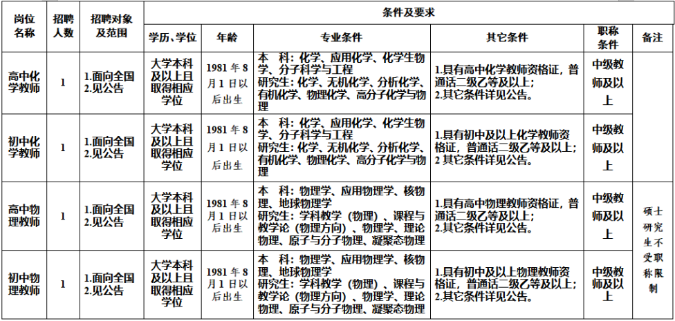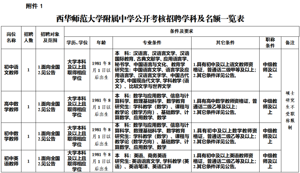 面向全国公开考核招聘2022年7月31日前取得普通高等教育研究生学历和硕士及以上学位或具有大学本科学历且有中级及以上专业技术职称资格,并完全符合附件《西华师范大学附属中学公开考核招聘学科及名额一览表》(含表注,以下简称《岗位和条件要求一览表》)相关岗位条件要求和本公告其他要求的人员。