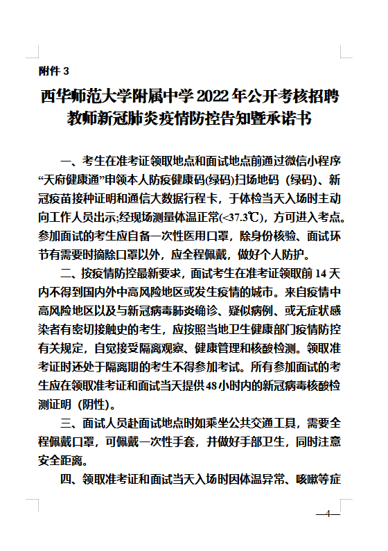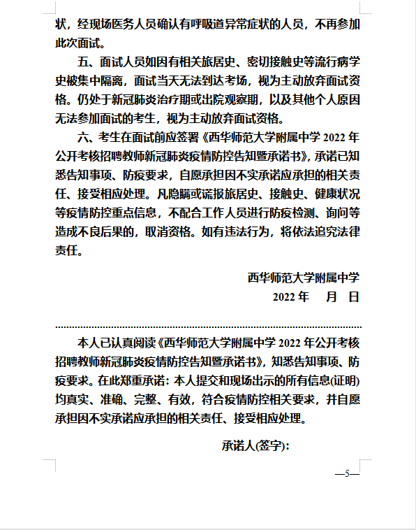 1.面试考生到达面试地点前签署《西华师范大学附属中学2022年公开考核招聘教师新冠肺炎疫情防控告知暨承诺书》(附件3)。凡谎报、瞒报旅居史、接触史、健康状况等疫情防控信息,不配合工作人员进行防疫检查、询问等造成不良后果的,取消聘用资格;如有违法情况,将依法追究相应法律责任。