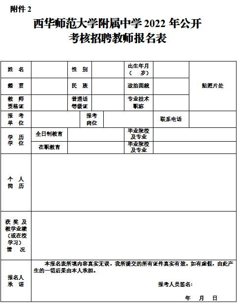 (1)《西华师范大学附属中学2022年公开考核招聘教师报名表》1份(见附件2),由报考者下载打印填写;