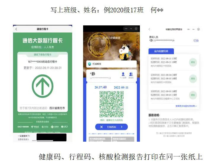 1.除暂缓返校学生外,其他所有返校学生需提供:思源学校2022年秋开学前健康自测及活动轨迹表、开学前48小时内天府健康码绿码、48小时内核酸检测阴性报告、行程码;(健康码、核酸报告、行程码打印在同一张纸上,写好班级、姓名)