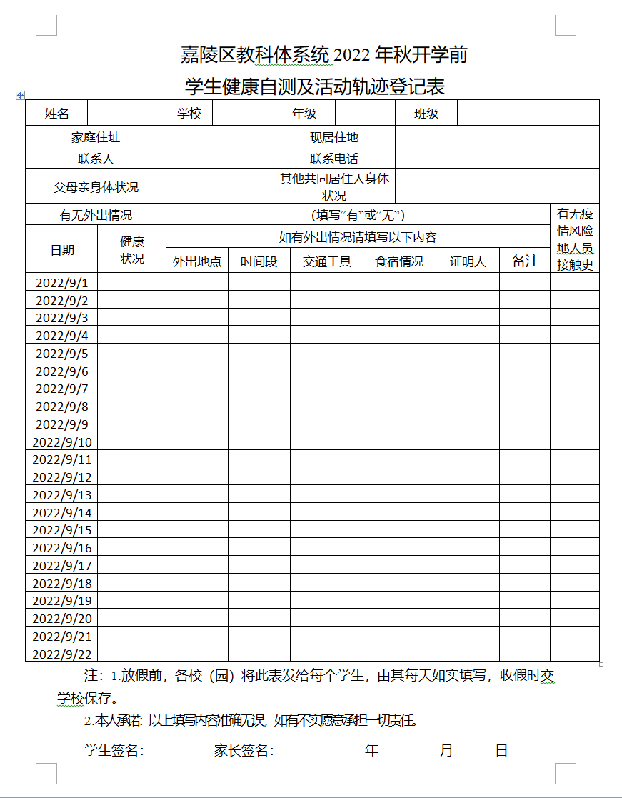1.返校前坚持每天如实填写健康自测及活动轨迹表,不到疫情中高风险地区、不与疫情中高风险人员接触,及时上报家人及同住人员外地返南(嘉)情况;