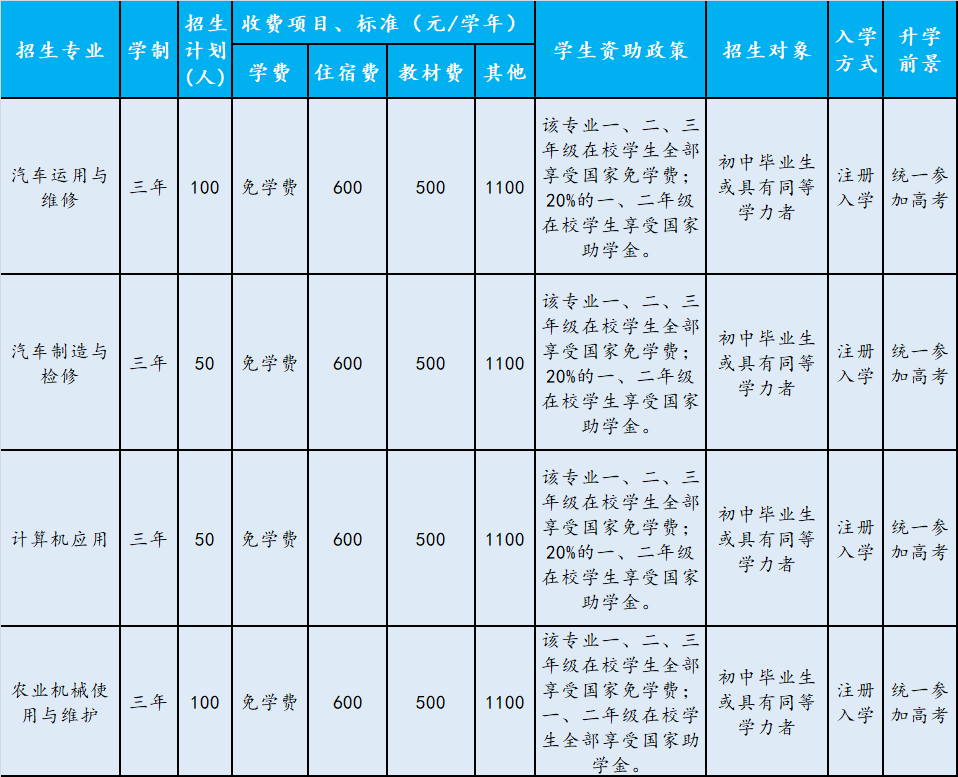 学校占地面积76225平方米,建筑面积21505.92平方米,总资产2250万元。现有教学楼、实习车间、学生公寓、运动场、食堂、实训基地等教学、生活设施。全校教职工53人,专任教师40人,双师型教师占专业教师的80%,其中,有技师12人。学校开设有汽车运用与维修、汽车制造与检修、计算机应用、农业机械使用与维护4个专业。