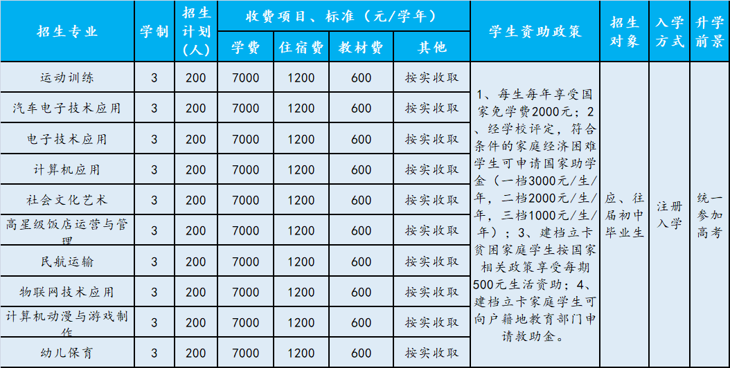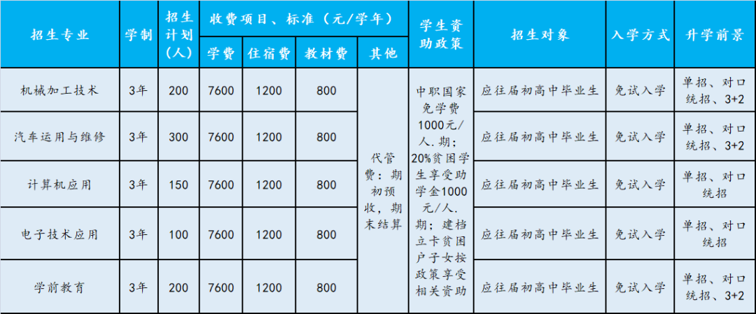 学校秉承一切为了学生健康成长和未来发展的理念,始终坚持贴近产业办专业,面向市场育人才,校企结合,产教融合,始终坚持用新思维、新手段、新形式解决教学问题,让学生享受学习。学校实行升学与就业双轮驱动,打通“中职——大专——本科——研究生”的升学通道,保证学生100%就业。