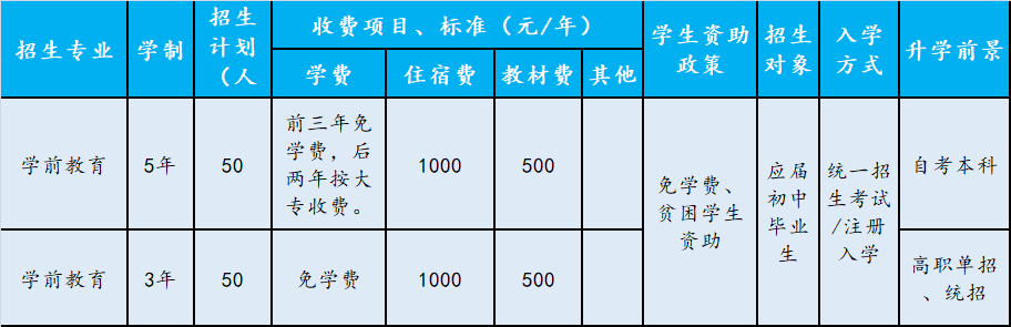学校坚持工学结合,校企合作,知行合一,产教融合,创新人才培养模式,着力培养学生就业创业能力,毕业生深受用人单位好评,毕业生一次性就业率稳定在95%以上,用人单位综合评价毕业生的称职率达90%以上。学前教育专业学生就业方向为幼儿园教师及幼儿保育、协助幼儿教师教育教学等相关工作,同时,三年制中职学前教育专业学生可通过高职单招、统招升入大专。