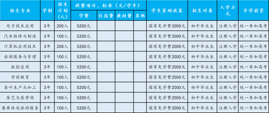 几年间,学校先后成功创建为省级重点中等职业资格鉴定、新型职业农民培训、网络教育为一体的中等职业学校。学校占地面积103.2亩,开设康养休闲旅游服务、旅游服务管理、电子应用技术、计算机应用技术、学前教育、数控技术、汽车维修、茶叶生产与加工、茶艺与茶营销9个专业。