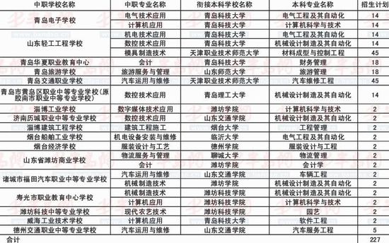 根据《 山东省教育厅关于下达2014年职业院校与本科高校对口贯通分段培养试点任务的通知》(鲁教高字〔2014〕13号),今年山东省“3+4”对口贯通分段培养试点中等职业学校共16所,共计21个专业点,衔接本科高校10所,招生规模920人 。其中,青岛市开展“3+4”试点的学校共有6所,分别是青岛电子学校、青岛华夏职教中心、山东省轻工工程学校、青岛旅游学校、青岛交通职业学校和黄岛区职业中专(原胶南职业中专)。对口的本科院校为4所,分别是青岛科技大学、青岛理工大学、山东省师范大学和天津职业技术师范大学;6所中职学校总招生计划390人,其中面向青岛市招生计划227人(招生计划详见附表)。