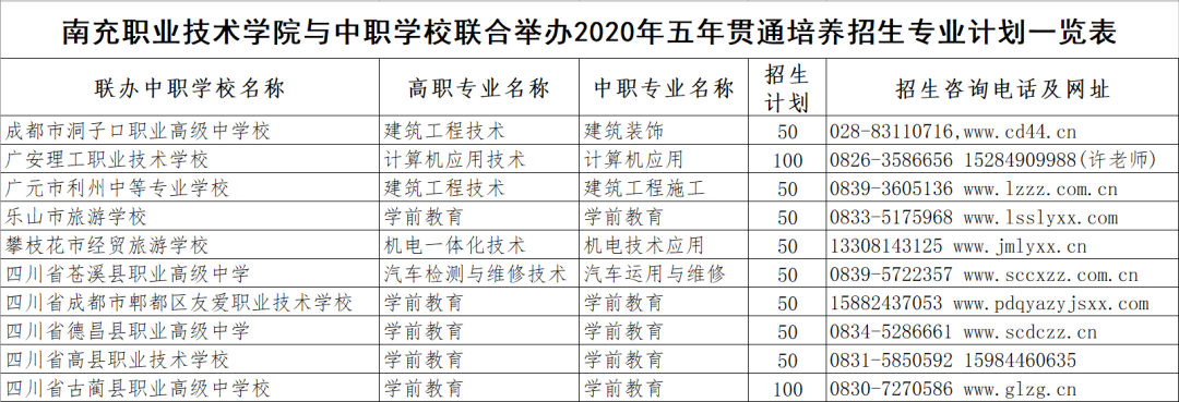 根据《四川省教育厅关于推进2020年中高职衔接五年贯通培养工作的通知》(川教函[2020]129号)以及《四川省教育厅关于公布2020年具有中高职衔接五年贯通培养招生资格的学校、专业及招生计划的通知》(川教函[2020]284号)精神,我院2020年将与24所中职学校联合举办中高职衔接五年贯通培养。现将有关事项公告如下: