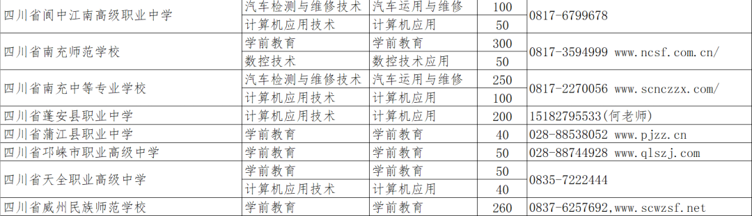 南充中等专业学校、四川省威州民族师范学校、四川省邛崃市职业高级中学、成都市郫都区友爱职业技术学校、成都市洞子口职业高级中学、四川省蒲江县职业中专学校、自贡市旅游职业高级中学、攀枝花市经贸旅游学校、古蔺职业高级中学、广元市利州中等专业学校、四川省苍溪县职业高级中学、乐山市旅游学校、南充师范学校、阆中江南高级职业中学、四川省蓬安县职业中学、四川省高县职业技术学校、宜宾市叙州区高场职业技术学校、岳池县白庙职业中学校、广安理工职业技术学校、四川省武胜职业中专学校、宣汉职业中专学校、天全职业高级中学、盐源县高级职业中学、四川省德昌县职业高级中学。