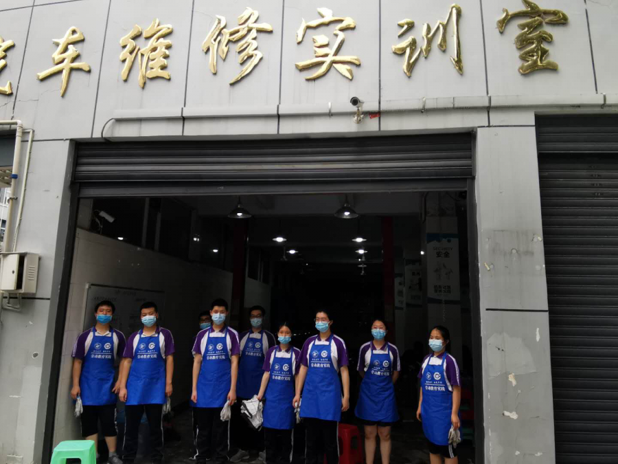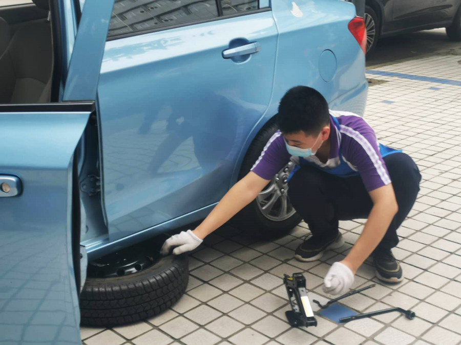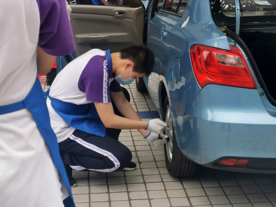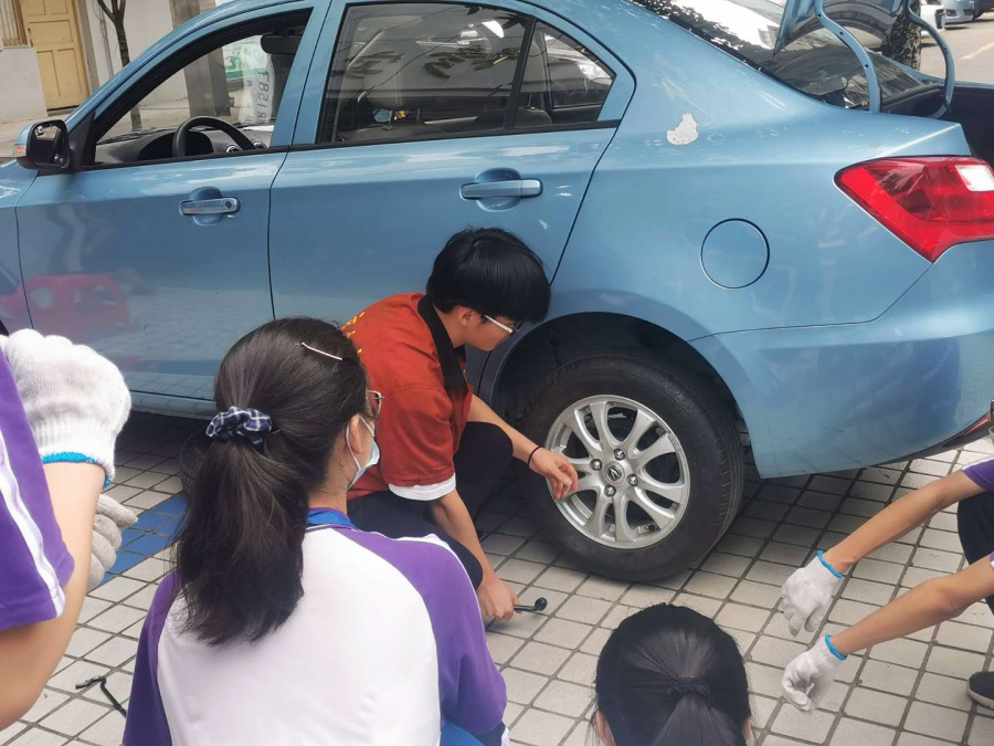汽修组的学员们简单快速地穿上蓝色工作服,一位中专的同学就开始了换备胎的详细教学:警示牌先放,螺栓的对角线拧松,千斤顶使用时的接触位置,拆卸换装备胎,又是螺栓的对角线拧紧。动作要领看似特别简单,结果学员们刚上手就遇到了一个让大家意想不到的问题:女生们力气比较小,搬不动备胎,拧不松螺丝。接着,最初听得很清楚的注意事项,在实际操作的时候通通忘掉了。于是,原本轻松愉快的心情一下子变得严肃起来,“纸上得来终觉浅,绝知此事要躬行”,大家真真切切深刻体会到了理论与实践的差距。正当同学们焦急时,天公不作美还下起了小雨。不过还好,女生搬不动备胎,男生主动帮忙,带伞的同学给正在操作的同学撑伞,动作细节老师也耐心提醒。在充分的团结合作下,终于完成了学习任务。