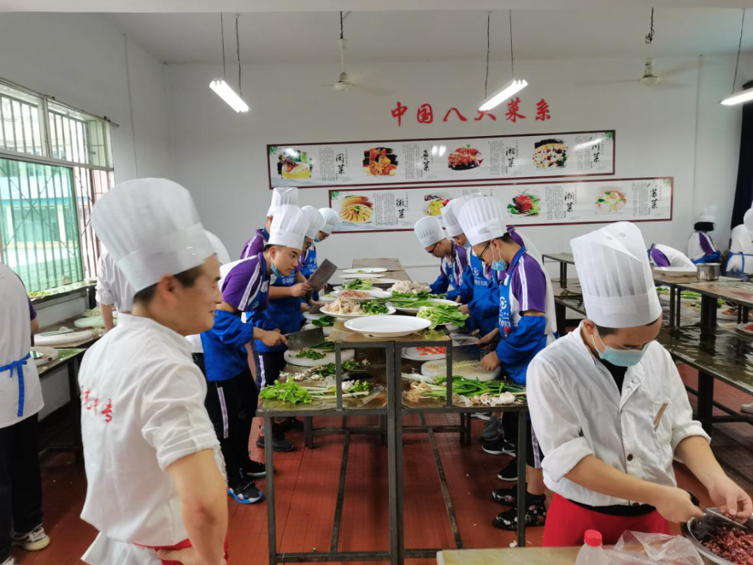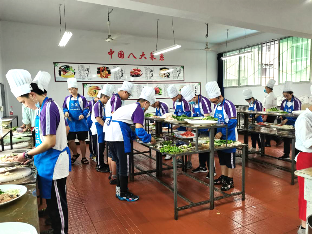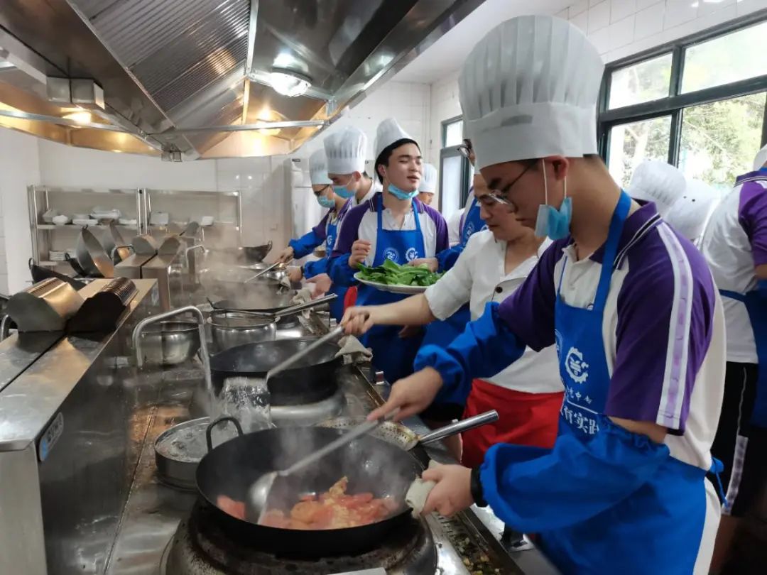 烹饪组的学员们随老师上了楼,来到了位于二楼的烹饪实训室。令人忍俊不禁的是,学员们真的是太缺少生活的经验了,有的连厨师帽都戴反了。指导老师为学员们一边做示范,一边详细讲解,从洗菜到切菜再到炒菜,细致入微。不同于家庭炉灶天然气燃烧的文静,烹饪实操室使用的煤气燃烧时火光冲天,并发出隆隆的声响,学员们努力克服内心的恐惧,尽力去认真完成每一道菜。虽然有的同学因为切了辣椒忘记及时洗手,导致手火辣辣地疼;有的同学因为实训室的高温满头大汗;有的同学因为油星溅到身上弄脏了衣服,但是最终大家还是成功地做出了一大桌子的菜。看着自己的成果,同学们感到特别自豪。