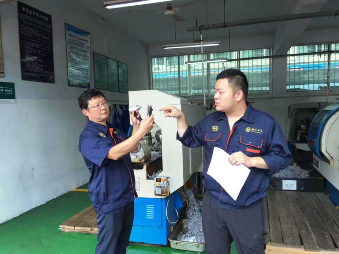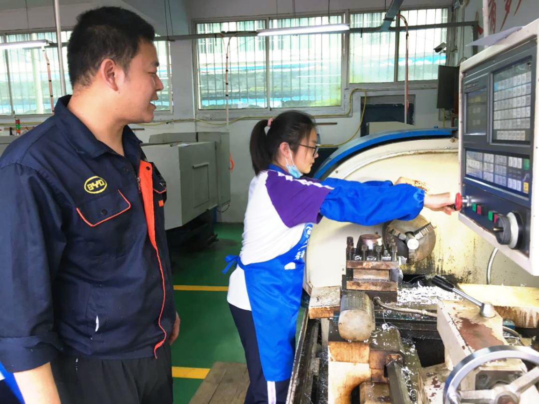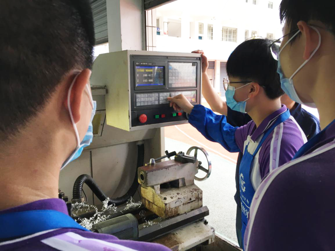 数控加工组的同学们怀着紧张而又好奇的心情,向操场的一角走去,远远看着有几个类似于发动机一样的机器,其中一个还在工作中。指导老师带领同学们到了一个加工间,介绍了几个国外较为先进的机器。令同学们感触颇深的是,当师傅介绍机器本身加工的机体外壳时,很自豪地说这是中国沈阳第一机床制造厂造的,但讲到涉及核心的数控系统时,却带着丝丝忧愁说那些系统都是德国造、日本造。说到此时,又感慨到:华为、中兴等国家企业也是在高科技术方面被卡了脖子,时刻都有一把达摩克里斯之剑悬在头上,这种滋味很不好受,希望同学们努力学习,将来突破技术难关,让中国智造闪耀世界。听了指导老师的话,大家深感肩上责任重大,内心暗自告诫自己一定要奋发图强。接着,指导老师带大家来到实训室,拿出图纸,教大家如何理解图纸和程序。老师们非常细致地教大家怎样安装材料、预设基准点、测量尺寸、设置参数……带大家从头到尾完成了一个样品的加工。大家看着一块圆柱形铝合金在高速旋转下慢慢变成了一个精巧的陀螺,感到十分神奇。待老师做完样品后,同学们迫不及待地动手做起属于自己的陀螺来。只听见轰隆隆的运转声渐渐平息,一个个陀螺做好了,然后来一场陀螺大赛,车间充满了欢声笑语,一切的苦累都值了。