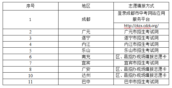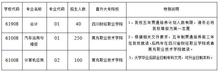 学生在规定时间段进入四川省各市州招生考试网公布的中考志愿填报网站,在五年制高职高专(3+2高职高专)栏目(窗口)按照要求填报我校五年制高职高专志愿(按提示填写学校专业及代码,见上表)。