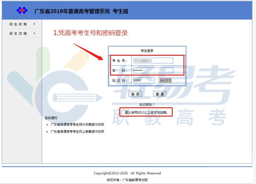 1.凭本人高考考生号和密码登录进入“广东省普通高考管理系统考生端”。