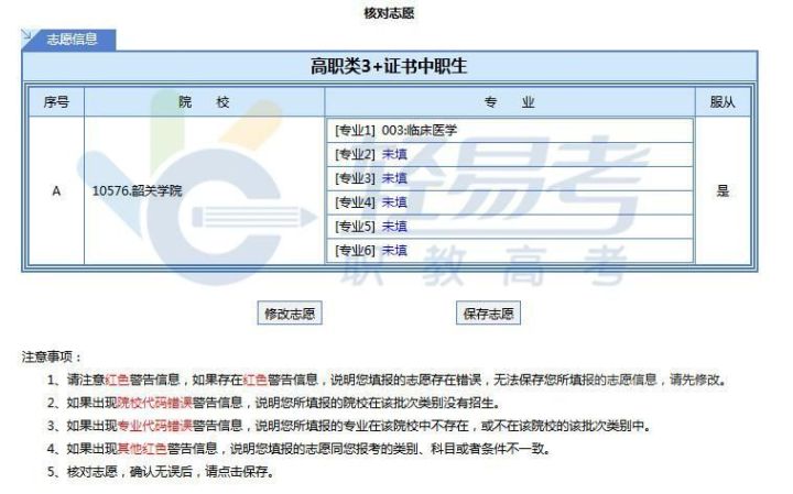 5、填完院校和专业代码后,点击“核对志愿”按钮,认真核对自己选的院校和专业是否正确,如有错误,可点击“修改志愿”按钮进行修改。