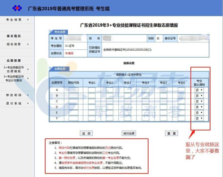 3、确认无误后,就可以点击“3+专业技能证书志愿填报”,进入志愿填报界面。填志愿前认真阅读页面下方的“注意事项”,“专业服从调剂”按钮在你的右手边,千万别看漏了。