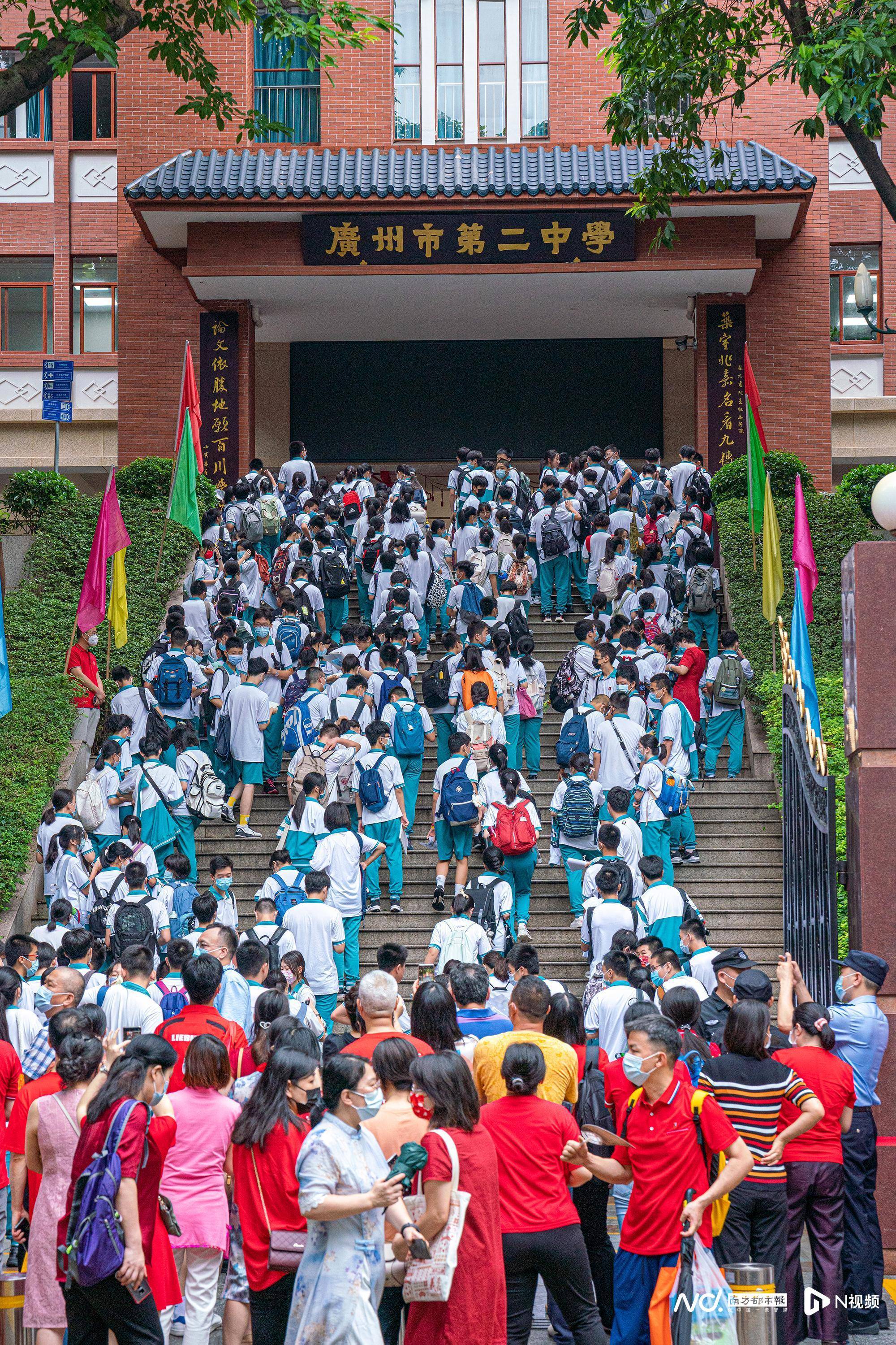 2022年6月20日08:14,广州市第二中学考点,考生迈入考场,不少家长身穿红衣目送考生。南都拍客 陈晓红 摄
