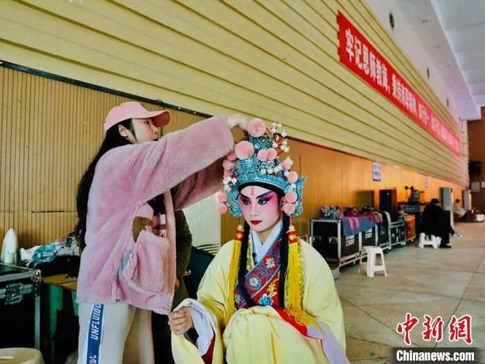 南充川剧非遗传习班老师为学员整理头饰。 杨波 摄