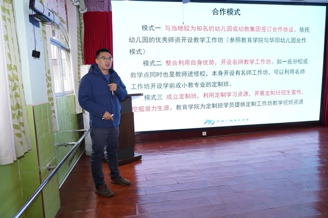 四川省广播电视大学吴润民老师,就基于产教融合的学前教育专业定制班合作项目,向与会老师介绍了本次合作的意义、模式、效益以及愿景,相信在三方合作能够有效地挖掘生源——促进教师发展——树立口碑——提升教学质量——落实产教融合~