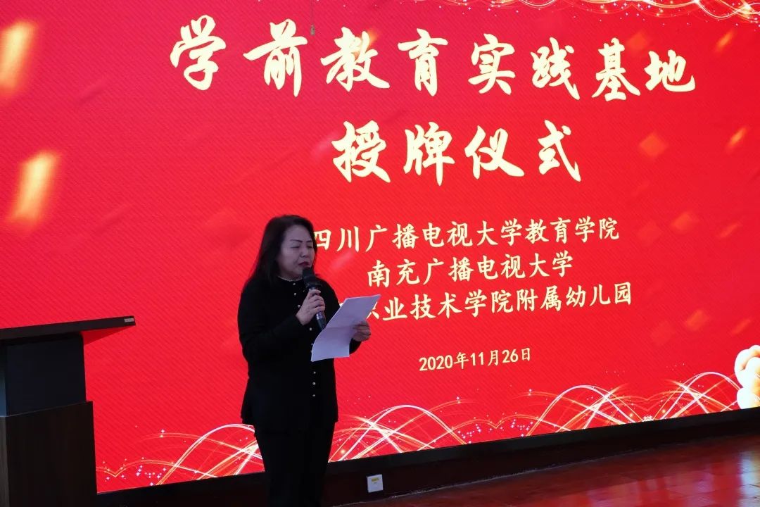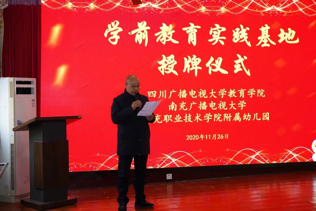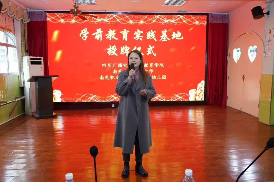 南充广播电视大学副校长王琪就实践教学基地签约表示祝贺,就为什么要建立实践基地?为何选择南职附幼?未来的合作将走向何方?王校长就共促本校、职幼师生,乃至我市学前教育事业与人才培养为主线,就本次授牌仪式的划时代意义给出了自己的想法与构想。