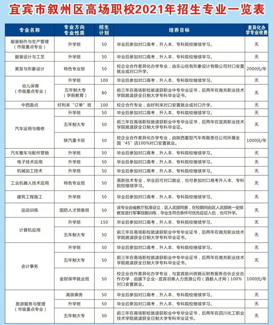 2.所有专业收住校费300元/期、书本费300元/期,除差异化办学专业学习费按合作企业和院校标准另行收取学费外,其余专业学费全免。
