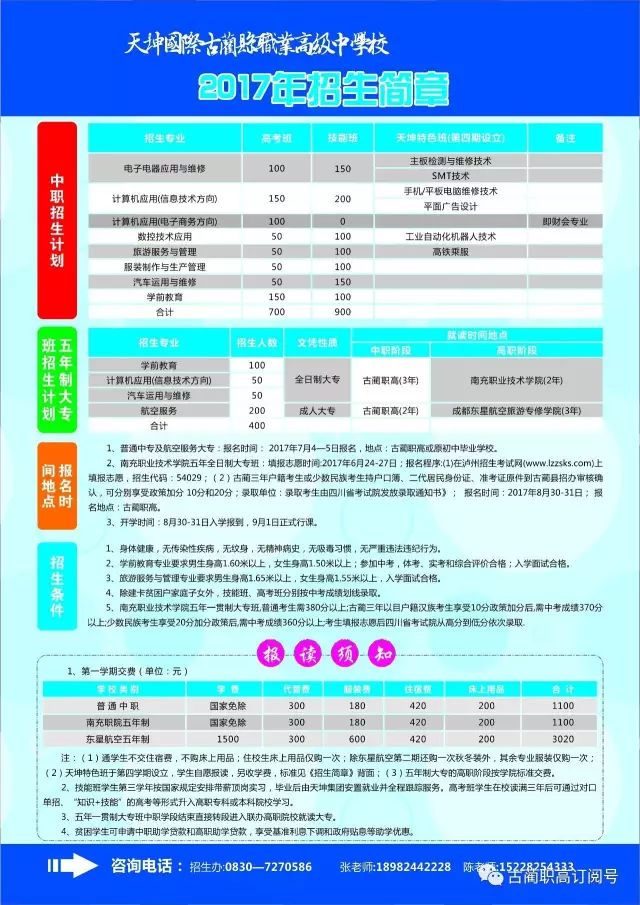 2.航空服务大专班:报名时间:2017年7月4—5日报名,地点:古蔺职高