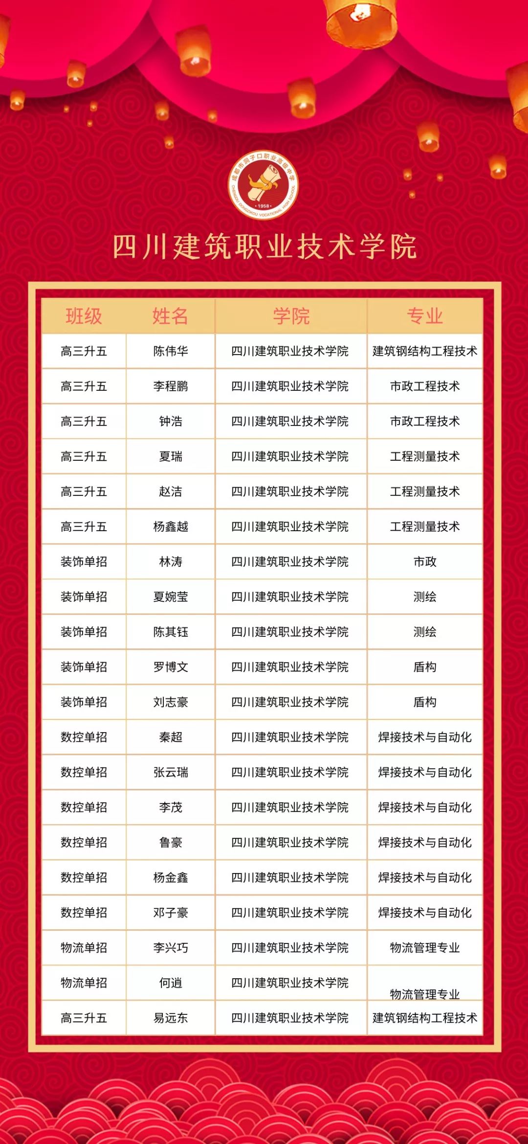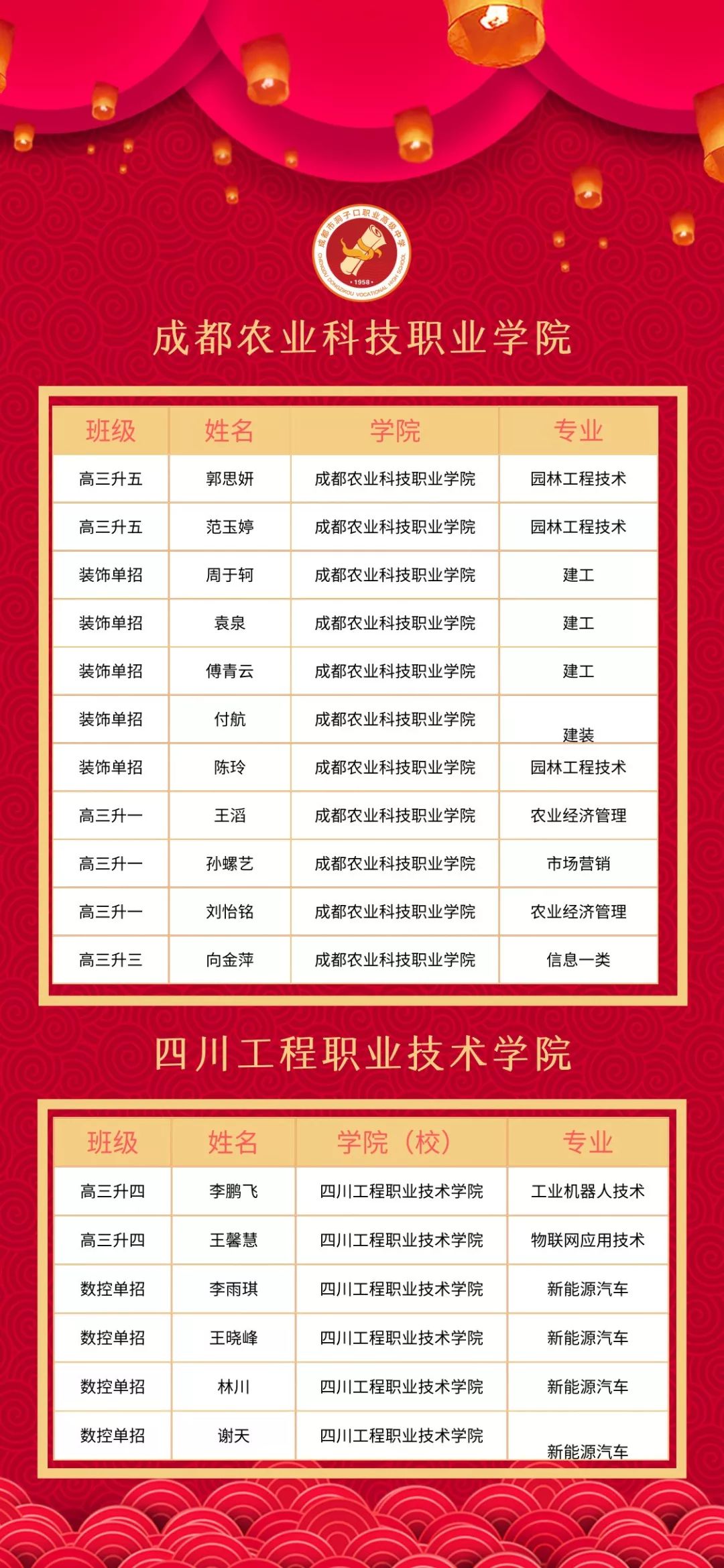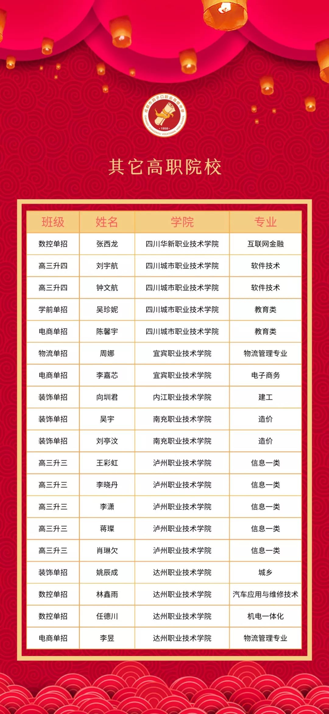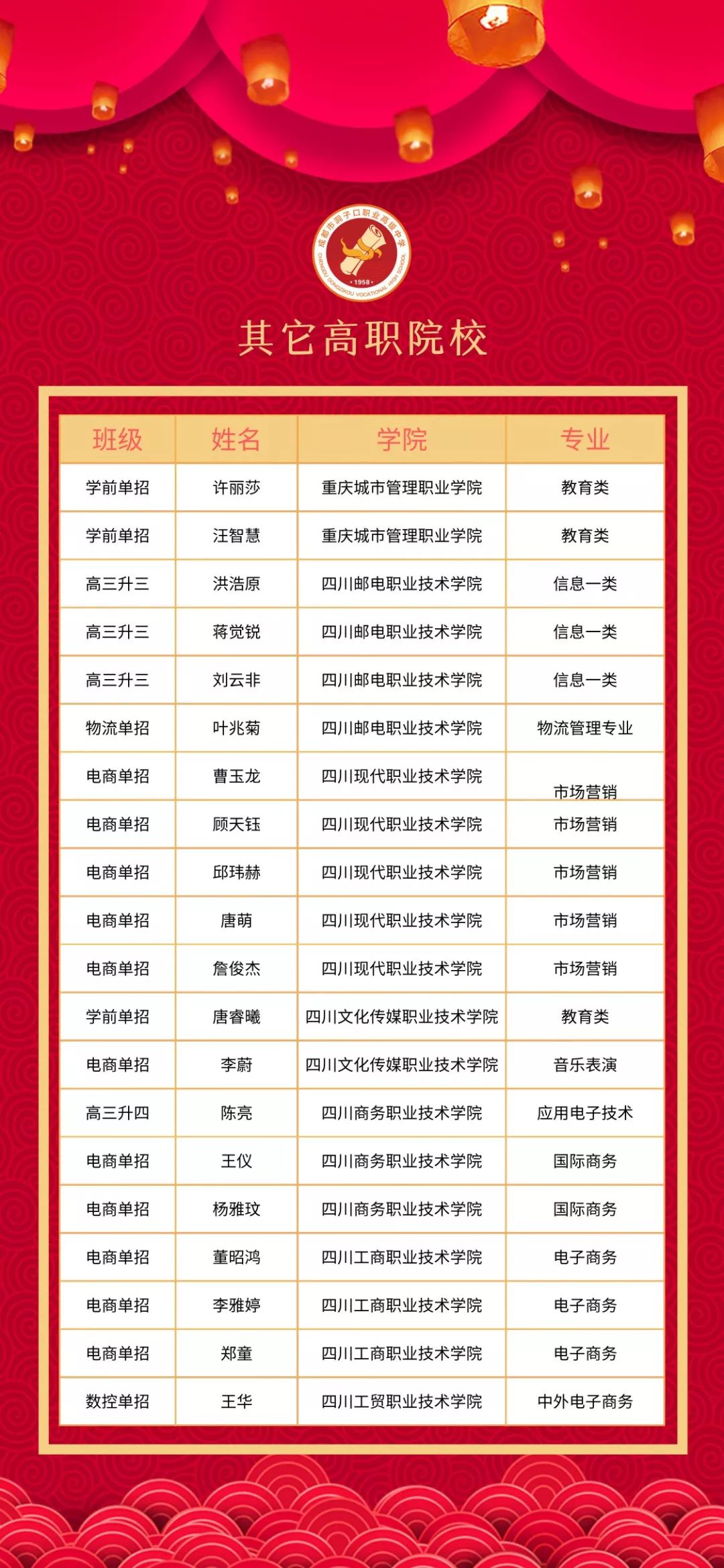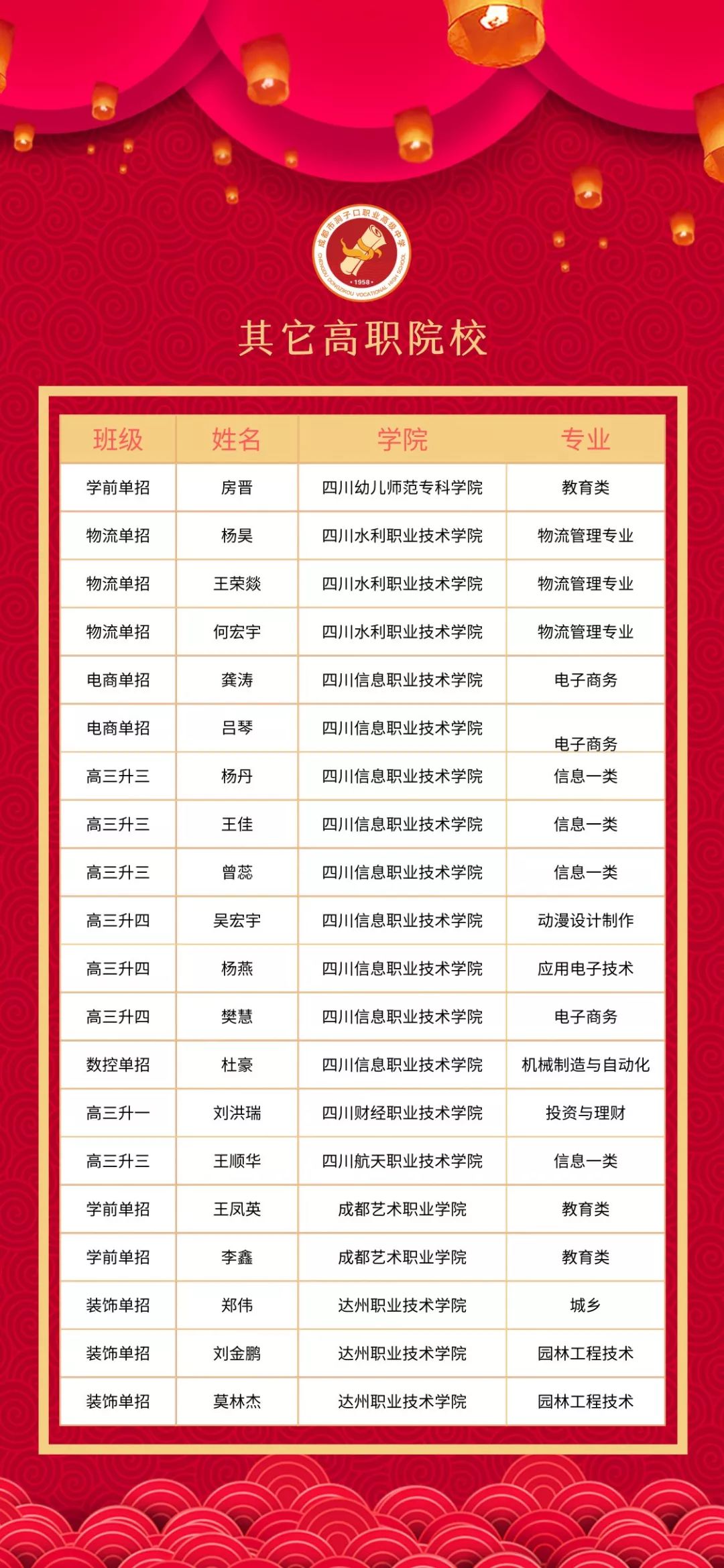 经过全校师生的共同努力,该校今年236人参加高职单招考试,录取221人,主要录取学校:四川建筑职业技术学院、四川交通职业技术学校、成都纺织高等专科学校、成都农业科技职业学院、四川财经职业学院、四川工程职业技术学院、成都航空职业技术学院、成都职业技术学院、四川工商职业技术学院、宜宾职业技术学院等高校。