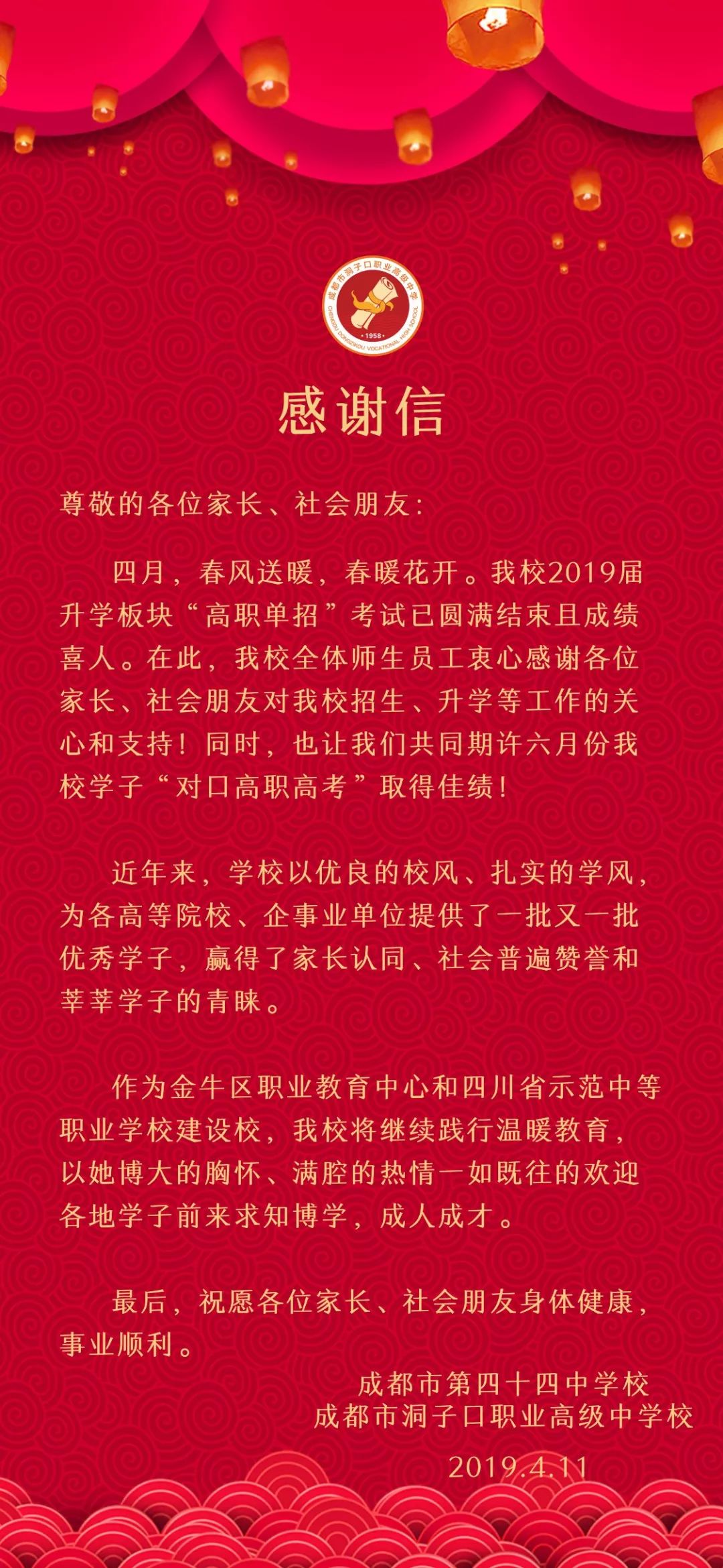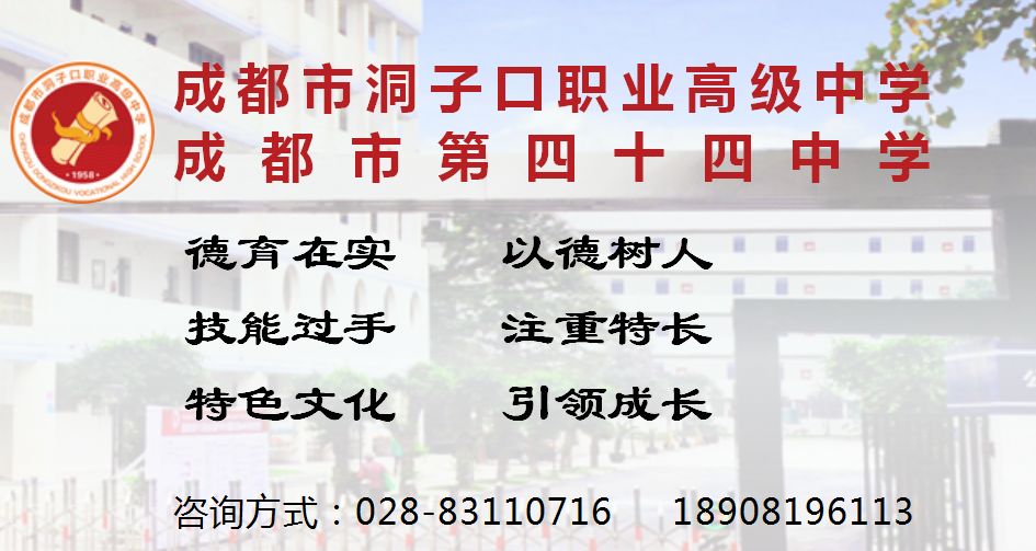 近年来,成都市洞子口职业高级中学校以优良的校风、扎实的学风、为各高等院校、企事业单位提供了一批又一批优秀学子,赢得了家长认同和社会普遍赞誉与莘莘学子的青睐。作为成都市金牛区职业教育中心和四川省中等职业学校建设校,将继续践行温暖教育,以博大的胸怀、满腔的热情一如既往地欢迎各地学子前来求知博学、成人成才。在2019年高职单招考试中,该校学子以优异成绩顺利升学。