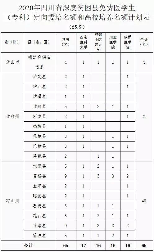 近日,省卫生健康委员会、教育厅等部门联合印发《2020年四川省深度贫困县免费医学生(专科)定向培养项目实施方案》。《方案》明确2020年定向委培免费医学生(专科)65人,其中乐山市4人、甘孜州21人、凉山州40人。培养专业为临床医学(专科),学制三年。由西南医科大学、成都中医药大学、川北医学院和成都医学院4所高校承担培养任务。招生对象为:参加四川省2020年普通高校对口招生报名,所填报对口专业类别为“医药卫生类”(专业类别代码为“12”)、且就读中职农村医学专业前户籍为我省45个深度贫困县的2020年农村医学专业应届毕业生。(省卫生健康委员会)