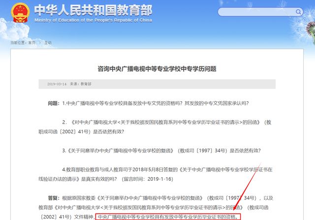 即电大中专前承初中学历、后启专科、本科等高等教育。三、电大中专是真的吗?正如前文介绍的,电大中专是经原国家教委批准的,并依托国家开放大学设置的中专学校,是全国唯一一所成人中专,当然是真的。在”中央广播电视中等专业学校“官网,以及”中华人民共和国教育部“官网都有相关材料可以证明电大中专的正规性。