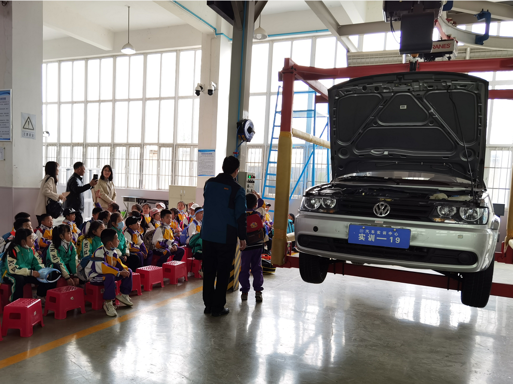 东山国际小学学生在成都汽车职业技术学校现场观摩汽车保养