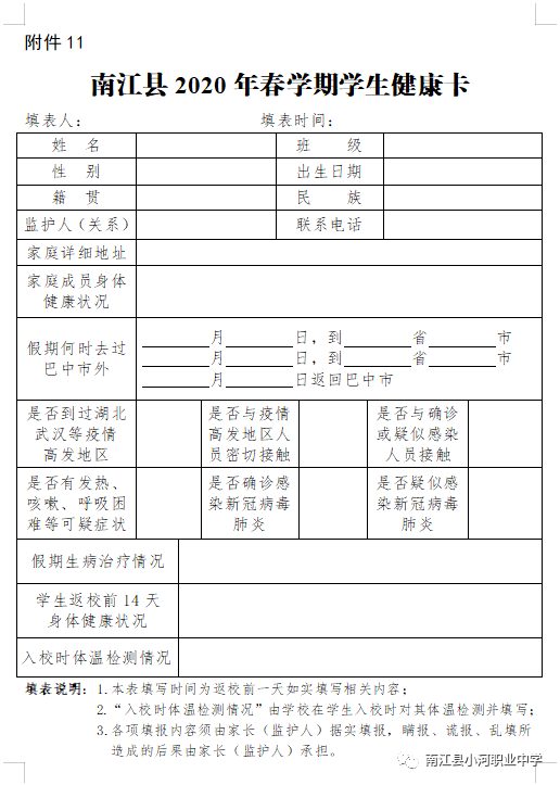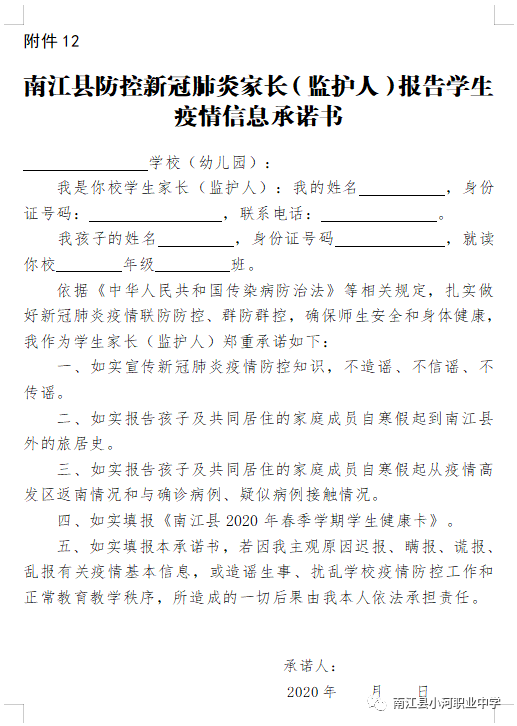 3、所有学生及家长提前如实填写《南江县2020年春学期学生健康卡》、《南江县防控新冠肺炎家长(监护人)报告学生疫情信息承诺书》,县外低风险地区学生还需开具《健康证明》,县外高风险、中风险地区学生继续等候返校通知,有感冒发烧等不适症状和传染性疾病学生康复后持医院证明返校。