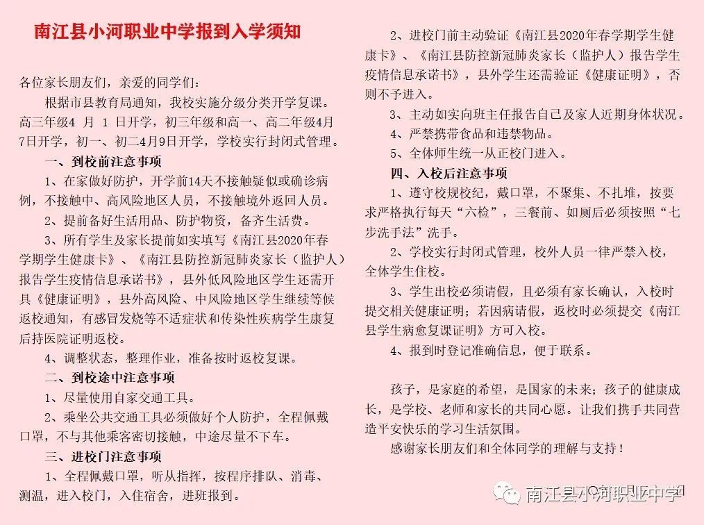 南江县小河职业中学2020年春学期入学须知