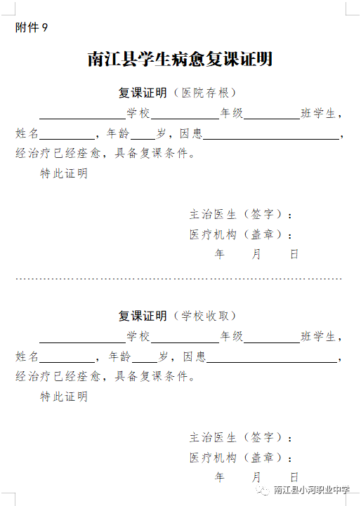 《南江县学生病愈复课证明》模板(打印文档可与在班级群下载)