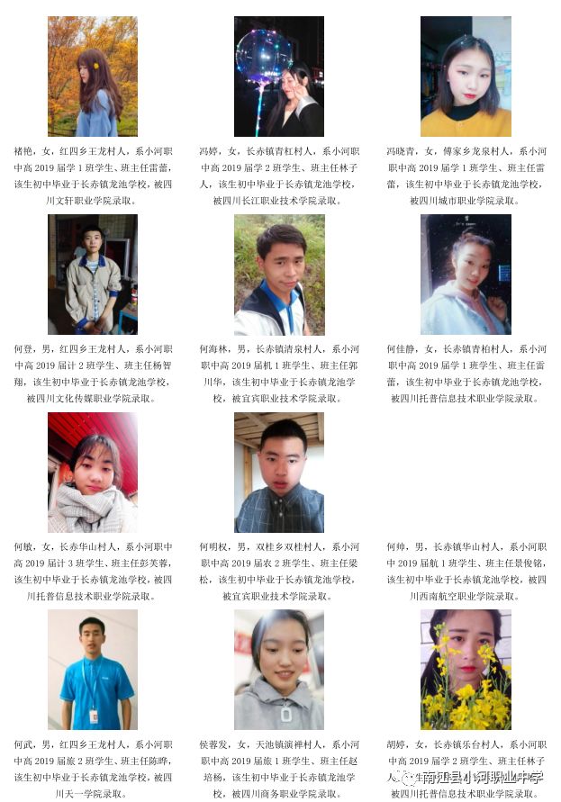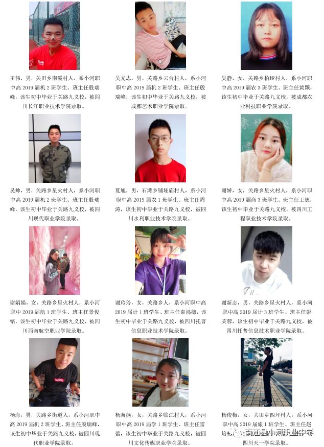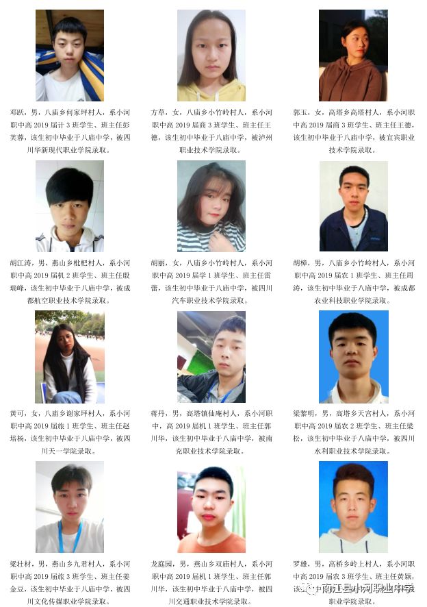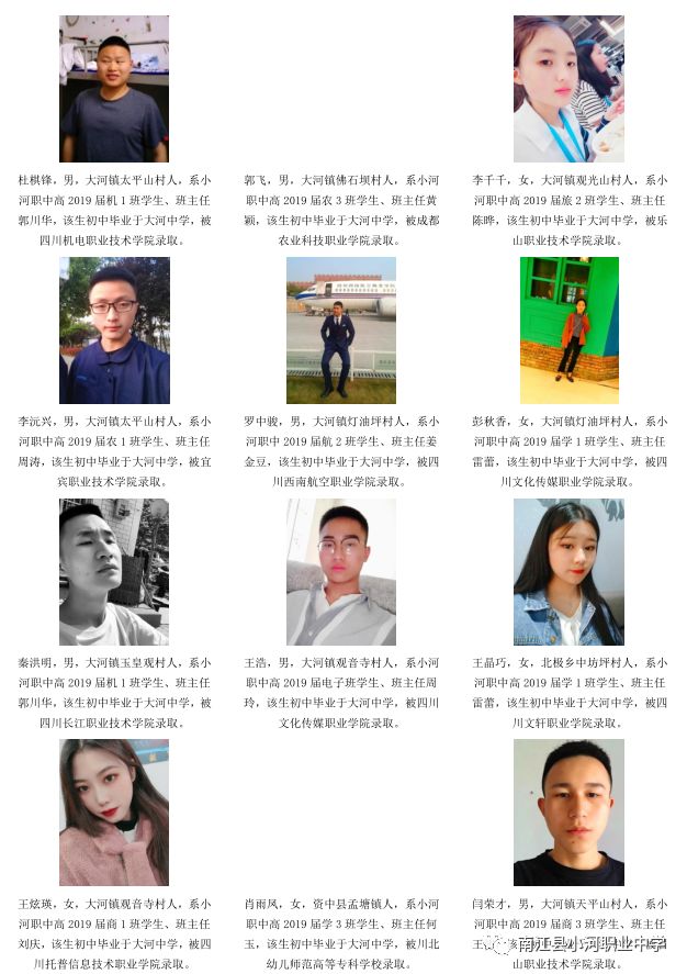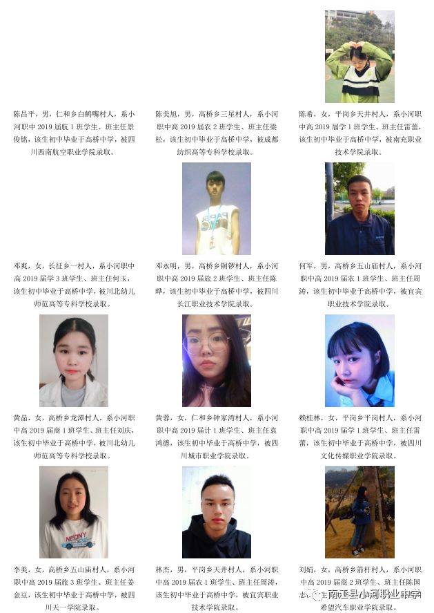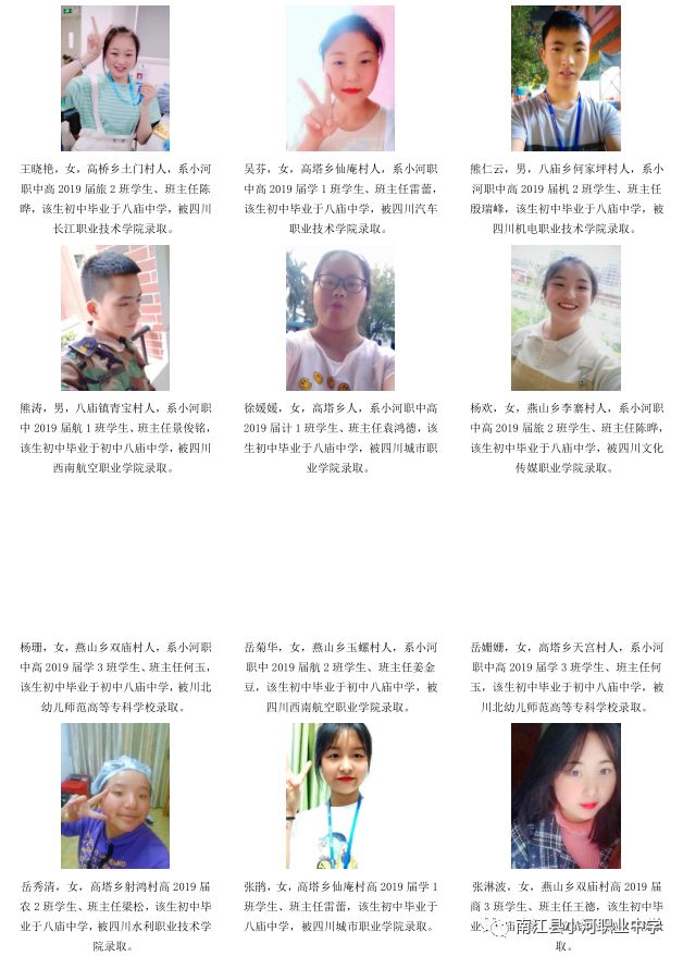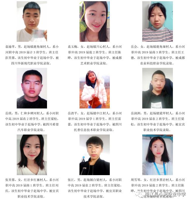 序言概述 喜悦分享 学生名单(小河职中、兴马九义校、杨坝九义校、正直中学、其他学校) 高等学府 2018年职教高考辉煌 我们的校园