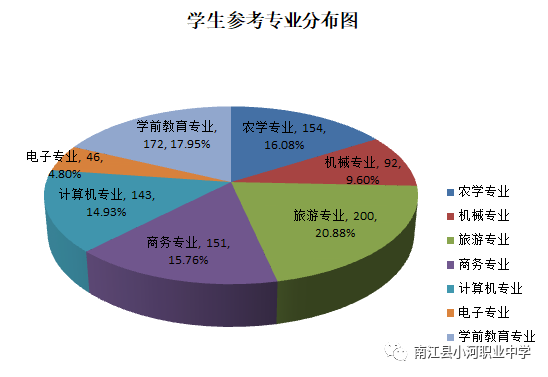 1、学生参考情况 本次参考学生共计958人,其中农学专业154人、机械专业92人、旅游专业200人(含四川西南航空职业学院2+3套读32人)、商务专业151人(川北幼儿师范高等专科学校3+2转录1人)、计算机专业143人、电子专业46人、学前教育专业172人(川北幼儿师范高等专科学校3+2转录63人)。其分布详见下图: