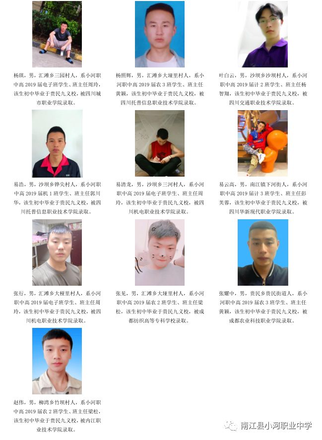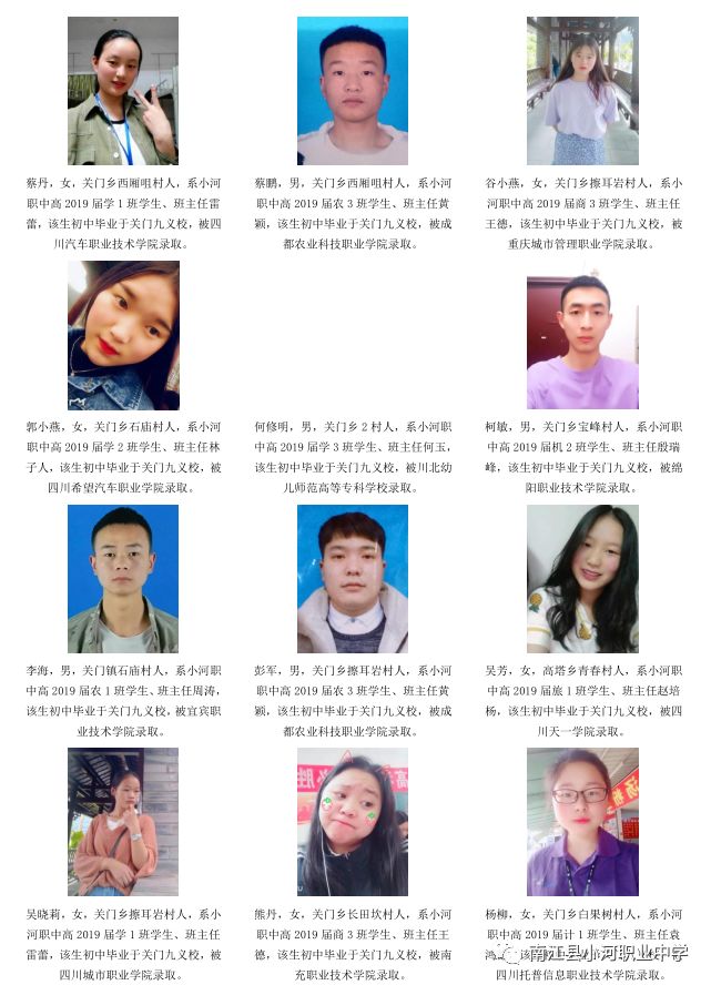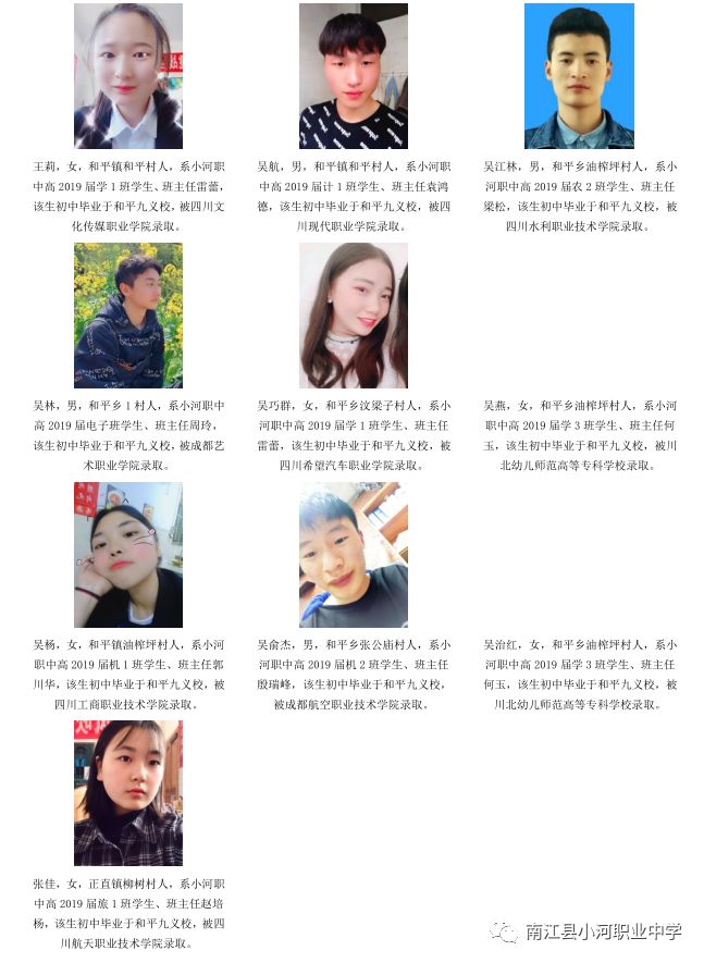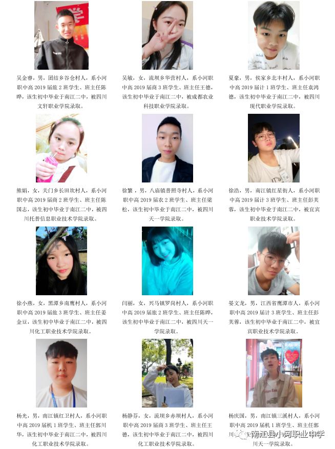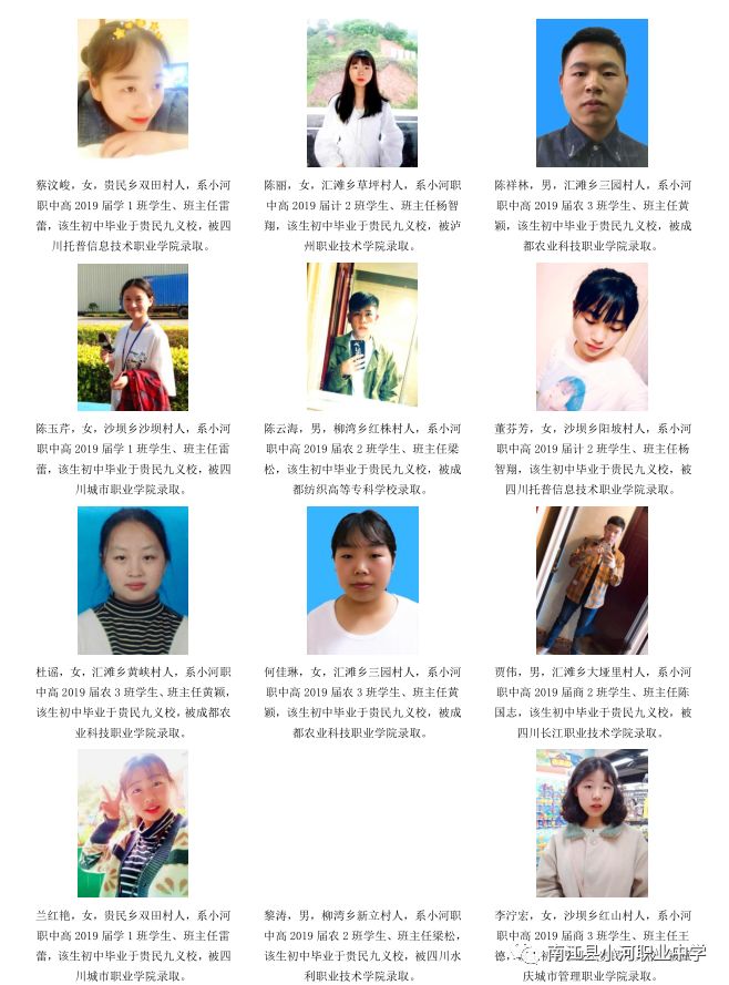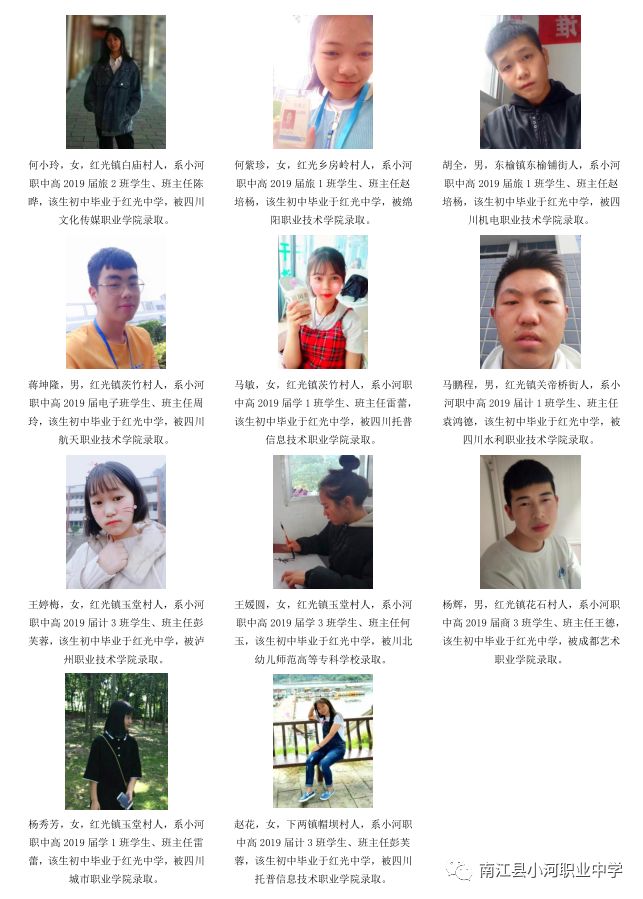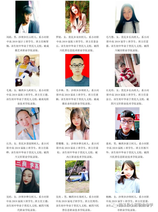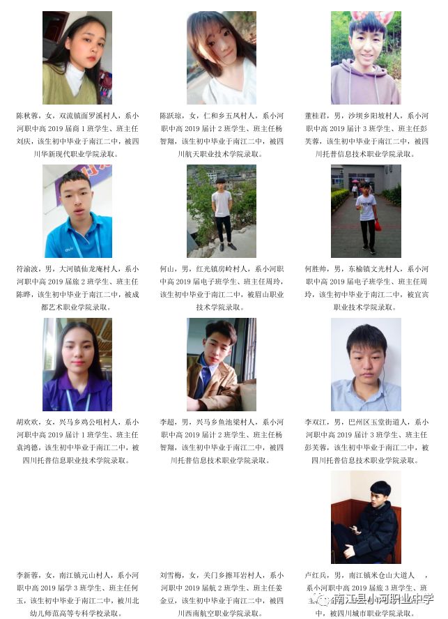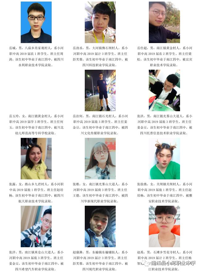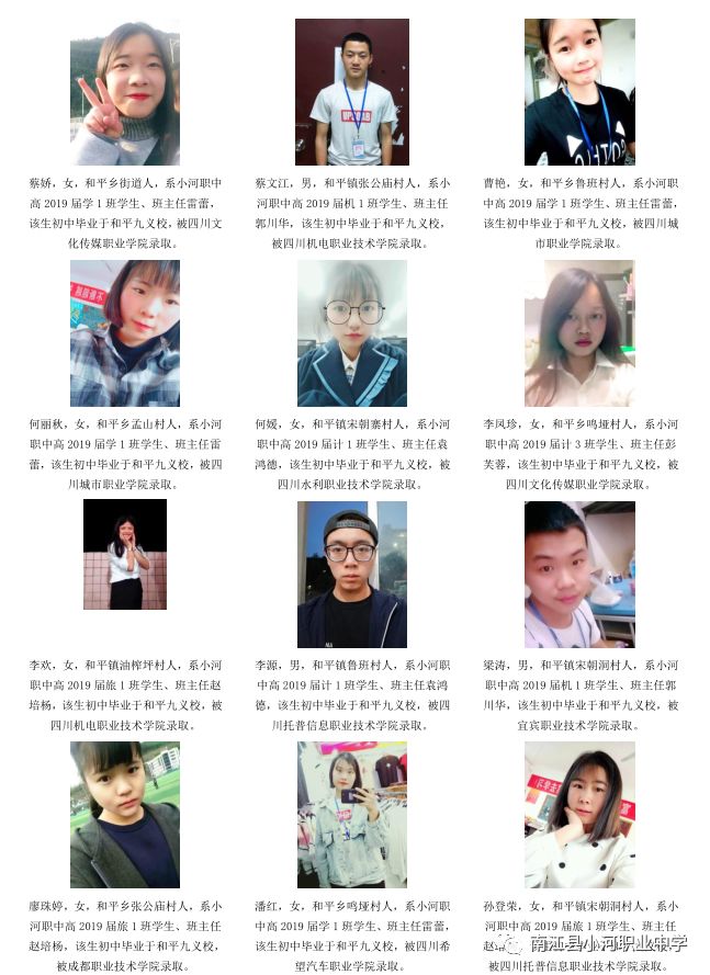 序言概述 喜悦分享 学生名单(小河职中、兴马九义校、杨坝九义校、正直中学、其他学校) 高等学府 2018年职教高考辉煌 我们的校园