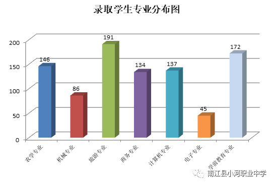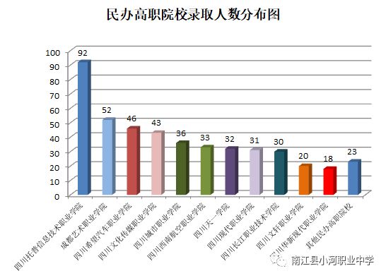 2、学生录取情况本次确认被录取学生911人,单独招生考试录取率95.09%,公民办高职院校录取人数比为456:455、比率为1:1;其中农学专业录取学生146人、录取率94.8%,机械专业录取学生86人、录取率93.48%,旅游专业录取学生191人、录取率95.5%,商务专业录取学生134人、录取率88.74%,计算机专业录取学生137人、录取率95.8%,电子专业录取学生45人、录取率97.83%,学前教育专业录取学生172人、录取率100;其中公办高职院校录取学生中,宜宾职业技术学院68人、川北幼儿师范高等专科学校65人,成都农业科技职业学院39人、成都纺织高等专科学校23人、南充职业技术学院23人、四川机电职业技术学院22人、四川水利职业技术学院22人、泸州职业技术学院20人、四川财经职业学院20人、四川航天职业技术学院20人、四川化工职业技术学院19人,其他公办高职院校115人;其中民办高职院校中,四川托普信息技术职业学院92人、成都艺术职业学院52人、四川希望汽车职业学院46人、四川文化传媒职业学院43人、四川城市职业学院36人、四川西南航空职业学院33人、四川天一学院32人、四川现代职业学院31人、四川长江职业技术学院30人、四川文轩职业学院20人、四川华新现代职业学院18人,其他民办高职院校22人。其分布详见下图: