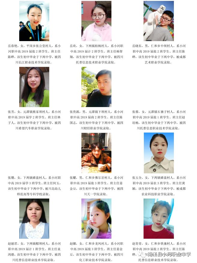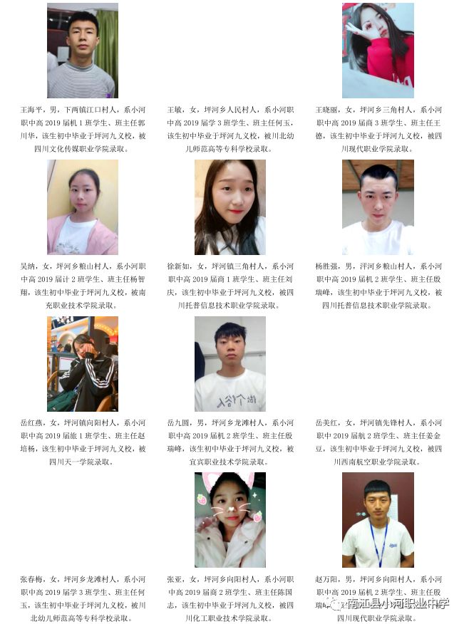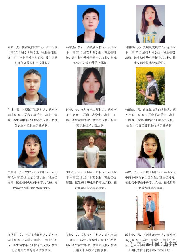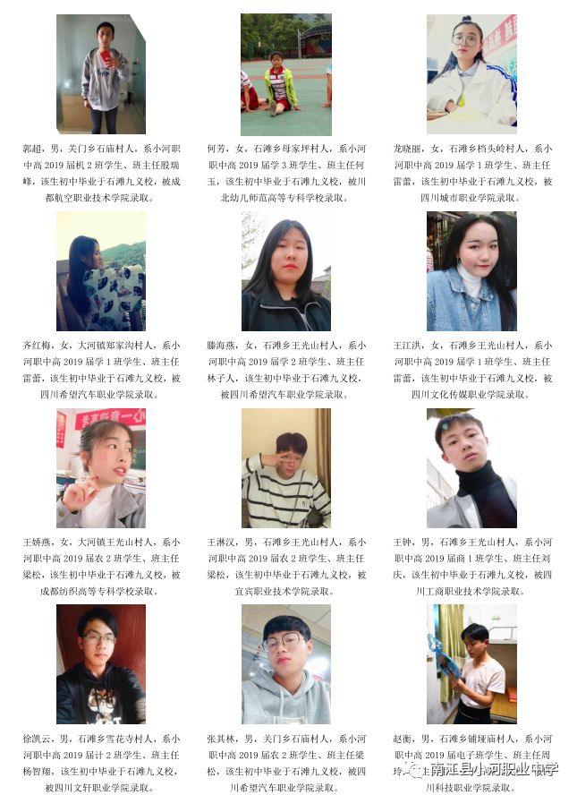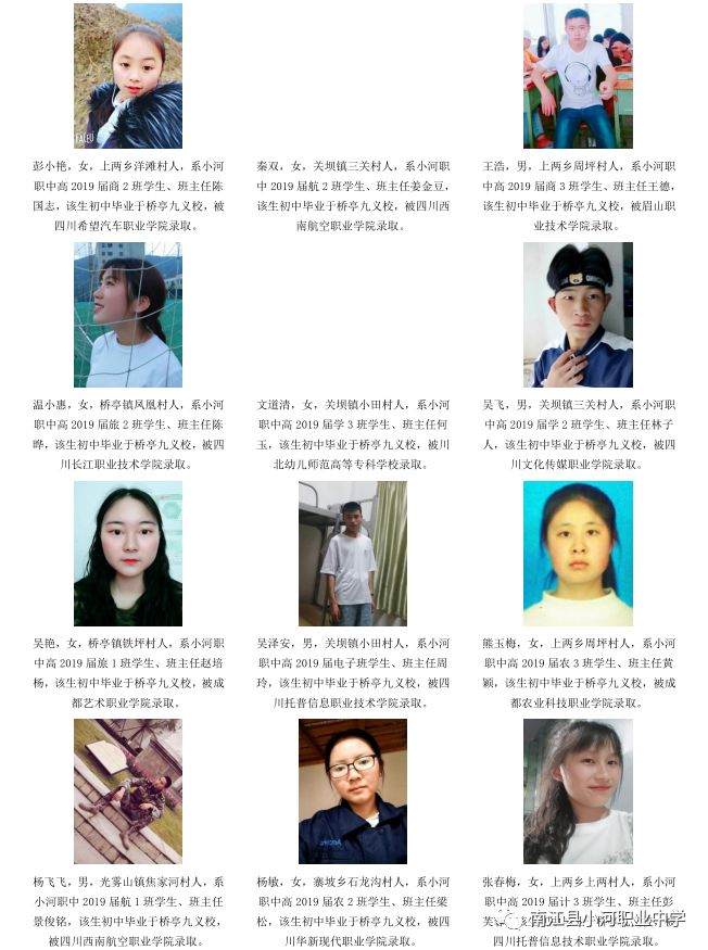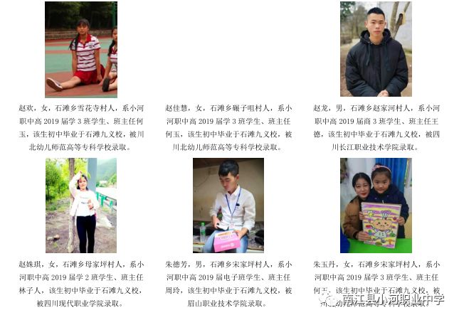 序言概述 喜悦分享 学生名单(小河职中、兴马九义校、杨坝九义校、正直中学、其他学校) 高等学府 2018年职教高考辉煌 我们的校园