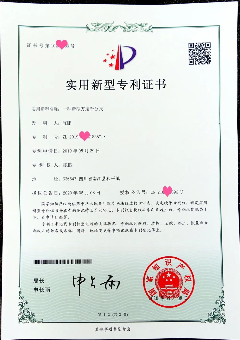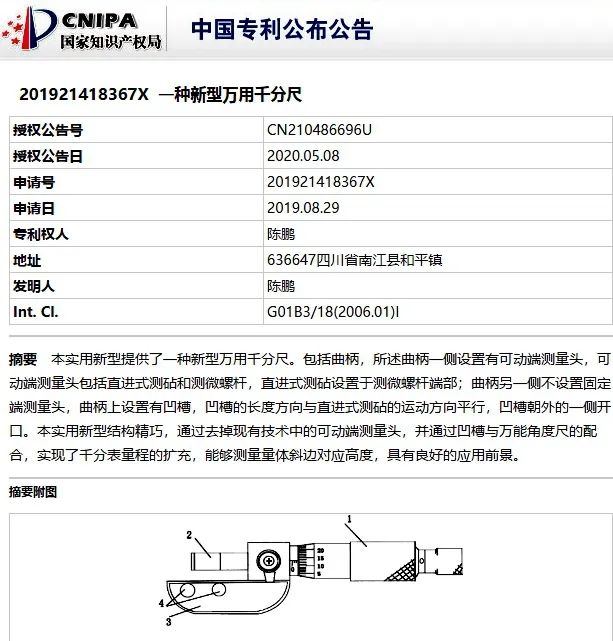 发明人陈鹏于2019年8月29日为“一种新型万用千分尺”向国家知识产权局申请专利,于2020年5月8日通过初步审查、决定授予专利权、颁发实用新型专利证书(专利权期限为十年)。这种新型万用千分尺,包括曲柄,所述曲柄一侧设置有可动端测量头,可动端测量头包括直进式测砧和测微螺杆,直进式测砧设置于测微螺杆端部;曲柄另一侧不设置固定端测量头,曲柄上设置有凹槽,凹槽的长度方向与直进式测砧的运动方向平行,凹槽朝外的一侧开口。本实用新型结构精巧,通过去掉现有技术中的可动端测量头,并通过凹槽与万能角度尺的配合,实现了千分表量程的扩充,能够测量量体斜边对应高度,具有良好的应用前景。