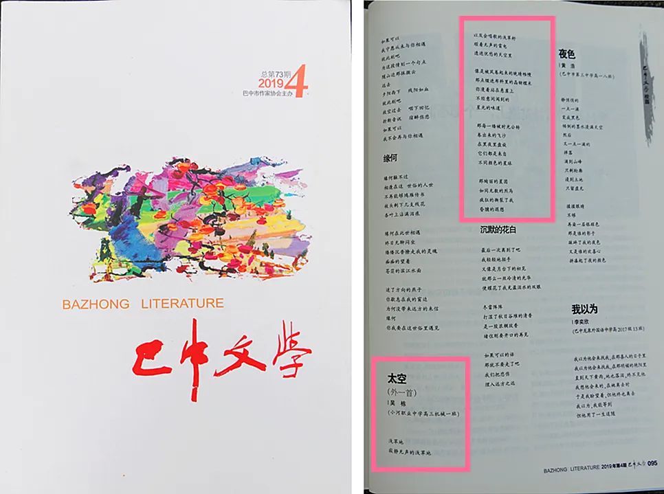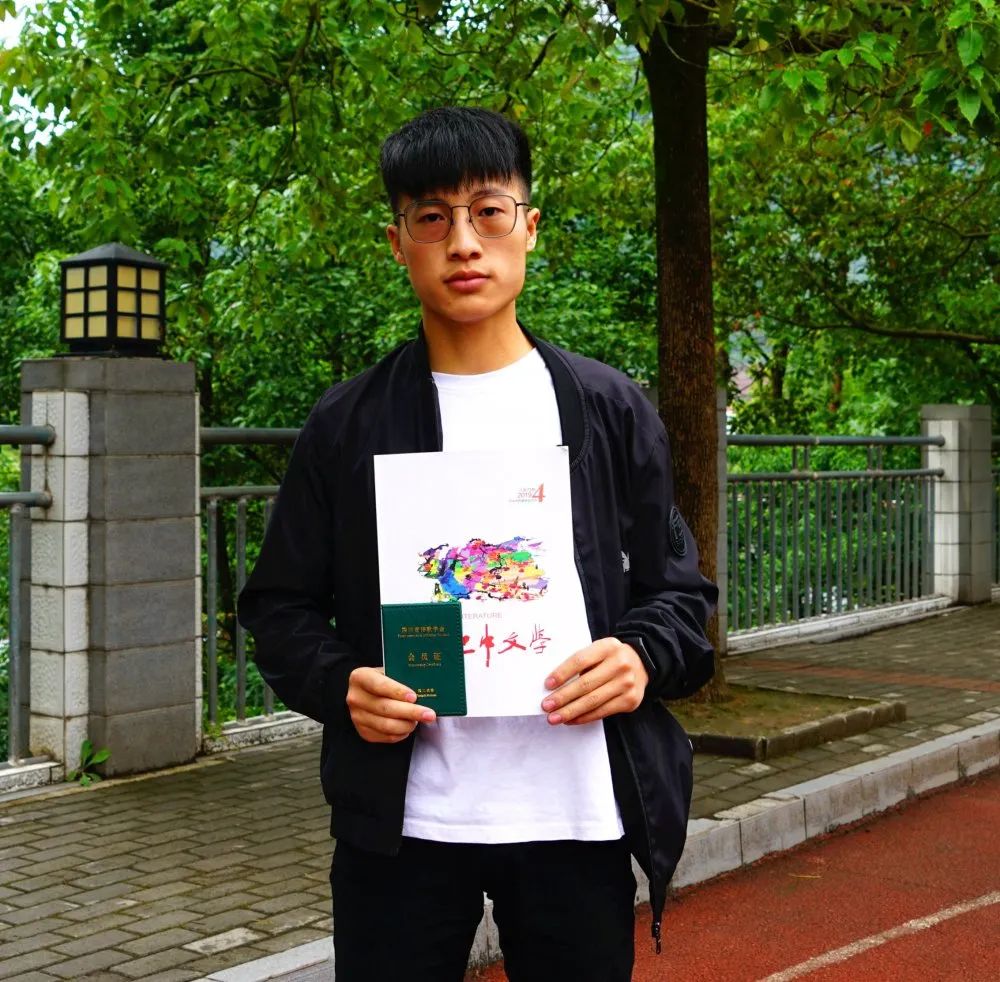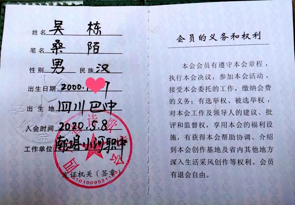 小诗人吴栋(笔名桑陌)的四川省诗歌学会学员证也是2020年5月8日签发的。一拿到这个会员证,吴栋十分激动,马上把喜悦分享给关心其成长的原班主任冷莉、指导其写作的语文老师胡亮和他的同学。作为四川省诗歌学会会员、岛屿诗社会员,青年文学家杂志社四川·巴中理事会分会组联部副部长,吴栋多次在青年文学家、巴中文学、岛屿诗社、百人百首诗等杂志微刊上发表自己创作的诗作,包括《每一片黄叶都在注视我》、《今夜我想沉沉睡去(外五首)》、《雨天赤裸》、《杂乱的时辰》等;也多次参加大赛、并获奖,包括“佛尘”读书三行诗大赛决赛二等奖、“中国国家图书馆”线上荐书短语大赛一等奖。