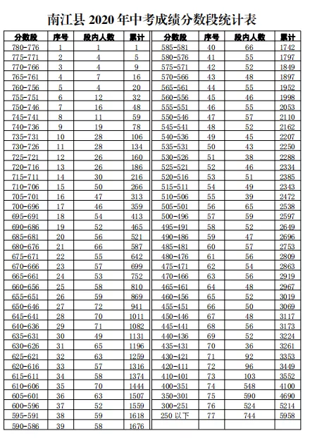 1、南江中学、长赤中学、实验中学、南江四中第一批次录取志愿填报最低分数控制线:585分(全县第1690名)。