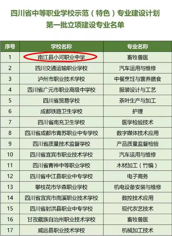 近日,四川省教育厅、四川省人力资源和社会保障厅、四川省财政厅联合发文公布了四川省示范中等职业学校第一批立项建设学校名单25所、四川省中等职业学校示范(特色)专业第一批立项建设专业名单30个,南江县小河职业中学畜牧兽医专业榜上有名。