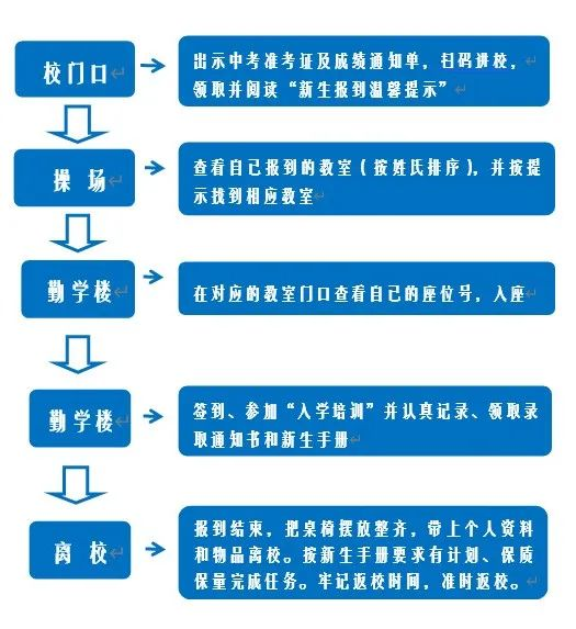 1号点签到,领取新生注册登记表,扫码进新生报到群→2号点交户口本复印件(首页、户主页、学生页)、身份证复印件资料各1份、体检报告、核查四类人员情况并领取资助政策宣传资料、领缴费通知单→3号点办理缴费手续、住校生办理入住手续并签订住校协议、领取住校生入住须知→4号点办理保险、签订就学协议、登记校服尺寸并领取校服→5号点交准考证、成绩单、户口复印件、身份证复印件资料各1份→6号点填写电子学籍信息、采集入学电子照片→7号点核查注册登记情况、发放录取通知书。